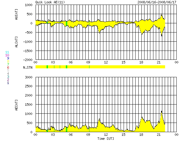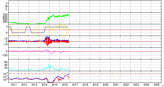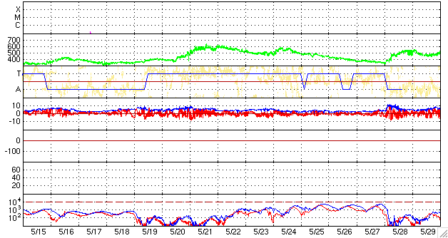 ACEが観測した太陽風の磁場(1番上の枠、白線は全体の強度、赤線は南北成分) および、太陽風の密度(3番目の橙線)、速度(4番目の黄線) (c) NOAA/SWPC ![]() リアルタイムAE指数 下段のAEグラフの値が高くなると、オーロラ活動が活発化しています。 (c) 京都大学, NICT ![]() シベリアで観測された3日間の磁場データ 右側の3分の1が、昨日のデータになります。グラフが上がったり下がったりすると、オーロラ活動が活発化しています。 (c) NICT ![]() 27日の太陽周期に合わせたデータプロット 太陽が同じ面を地球に向けていた27日前の変化から、今後を予想することができます。 (c) NICT