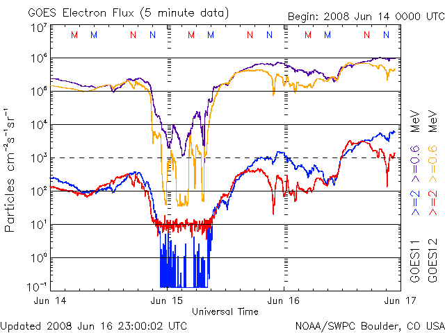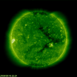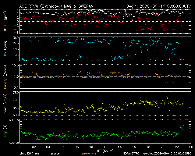 2008/ 6/17 08:03 更新 太陽風の速度は650-700km/秒に上昇しています。小さな黒点群が現れました。 担当 篠原 太陽風の速度はもう一段上昇し、650〜700km/秒に上がっています。 27日周期の図で、前周期の変化と比較して下さい。 前周期は、ちょうど今頃から速度が上がり始め、最高速度は600km/秒でしたが、 今周期は、到来が2日早まり、最高速度も700km/秒に強まっています。 コロナホールが強まって、太陽風の吹き出しも強まったのでしょう。 太陽風の磁場強度は、5nTを保っています。 南北成分は、細かく南北に振れる様に変化しています。 このため、磁気圏では500〜700nTの中規模のオーロラ活動が続いています。 太陽風の磁場強度がまだ弱まっていないので、 高速風はもうしばらくこの勢いが続きそうです。 SOHO EIT195を見ると、コロナホールの分かれ目になっているあたりが、 ちょうど地球への影響位置に来ています。 ここから吹き出ていた強い風が、今、地球へ来ているのでしょう。 今後、磁場強度が弱まり始めると、高速風は次第に弱まって行きます。 コロナホールの様子では、まだ3日くらいは高速状態が続きそうです。 放射線帯の高エネルギー電子は、更に上昇し、もうすぐ10,000に達しそうです。 高速風は続いていますので、明日には警戒ラインを超えそうです。 衛星の運用などでは注意が必要になるでしょう。 太陽では、東(左)の端に小さく、999黒点群が出現しました。 フレア活動はなく、太陽は穏やかです。 今日から、釜山へ出張に行きます。 金曜日まで更新が不定期になります。 ご了解ください。 SOHO衛星のEIT195カメラの映像 (c) SOHO (ESA & NASA)