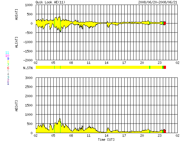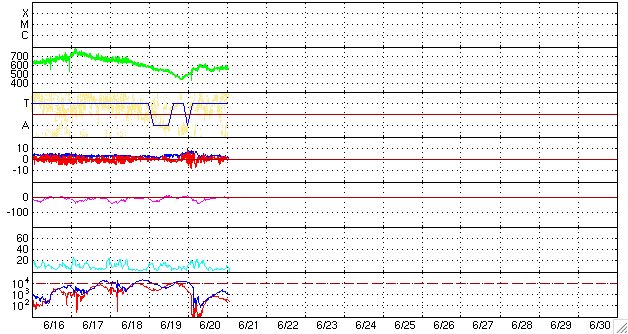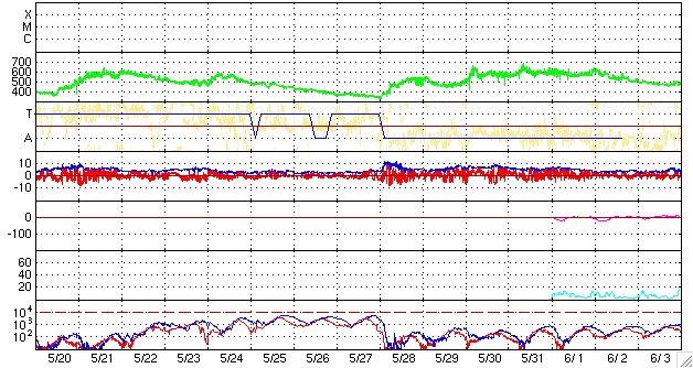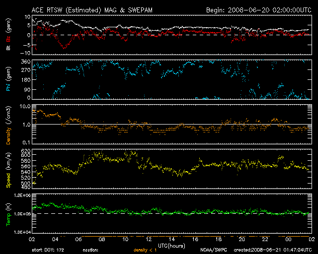 2008/ 6/21 10:48 更新 550km/秒前後の高速太陽風が続いています。磁気圏活動もやや活発になりました。 担当 篠原 速度550km/秒前後の、高速太陽風が続いています(ACEの図の黄色線)。 速度の山のできかたとしては、 前周期の変化がそのまま回帰して来たようです(27日周期の図参照)。 速度が高まるとともに、磁場強度(白線)は3nTへ弱まって行きました。 従って、高速風の山は既に後半に入っていて、やがて速度は下がって行くでしょう。 AE指数を見ると、図の前半で磁気圏がやや活発になっています。 太陽風の速度が高まっていたタイミングです。 磁場強度も5nTを超えていて、 南向き磁場(赤線のマイナスの変化)がこの磁気圏活動をもたらしたと考えられます。 その後は、太陽風の磁場強度が弱まってしまったので、 速度は高いものの、磁気圏への影響は小さくなっています。 AE指数の後半は、目立った変化はありません。 今後も、磁気圏活動は小規模の変化にとどまるでしょう。 太陽風の速度は、今後次第に下がって行くでしょう。 SOHO EIT195では、次のコロナホールの影が、太陽の東側(左側)中間あたりに見えています。 明日くらいになると、もう少しはっきり見えそうです。 放射線帯は、昨日の磁気圏の乱れを受けて、強度が大きく下がっています。 この後、ある程度戻して来そうなので、変化に注目してください。 太陽は、まん中にぽつんと999黒点群が残っています。 フレア活動はなく、とても穏やかです。 SOHO EIT195による、太陽コロナの様子。 (c) SOHO (ESA & NASA) ![]() ACEが観測した太陽風の磁場(1番上の枠、白線は全体の強度、赤線は南北成分) および、太陽風の密度(3番目の橙線)、速度(4番目の黄線) (c) NOAA/SWPC ![]() リアルタイムAE指数 下段のAEグラフの値が高くなると、オーロラ活動が活発化しています。 (c) 京都大学, NICT ![]() シベリアで観測された3日間の磁場データ 右側の3分の1が、昨日のデータになります。グラフが上がったり下がったりすると、オーロラ活動が活発化しています。 (c) NICT ![]() 27日の太陽周期に合わせたデータプロット 太陽が同じ面を地球に向けていた27日前の変化から、今後を予想することができます。 (c) NICT