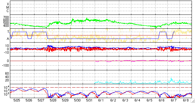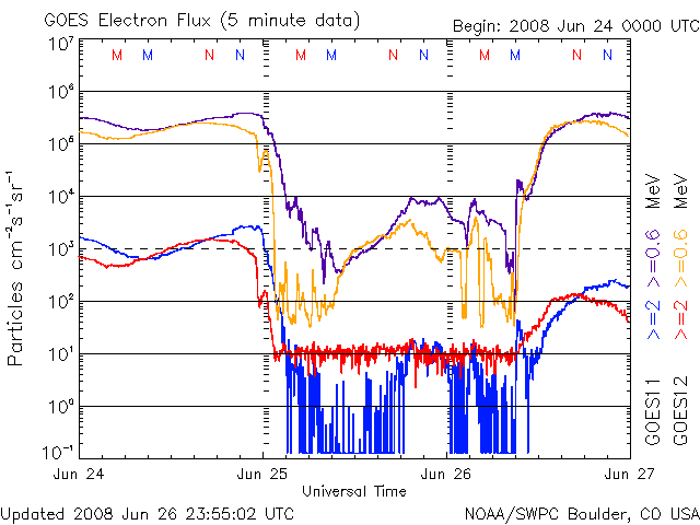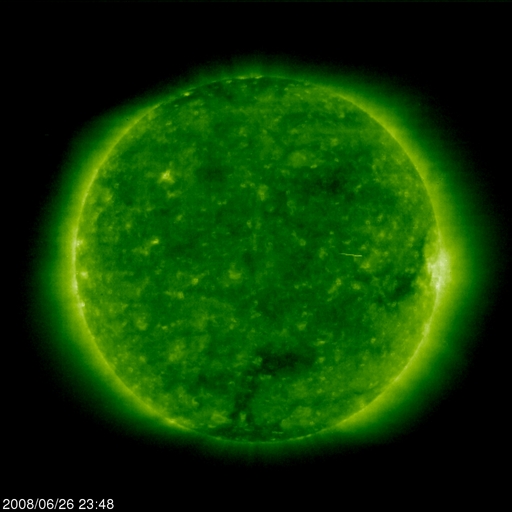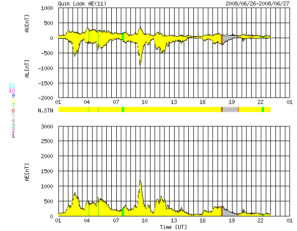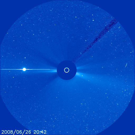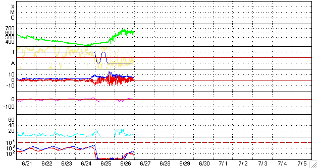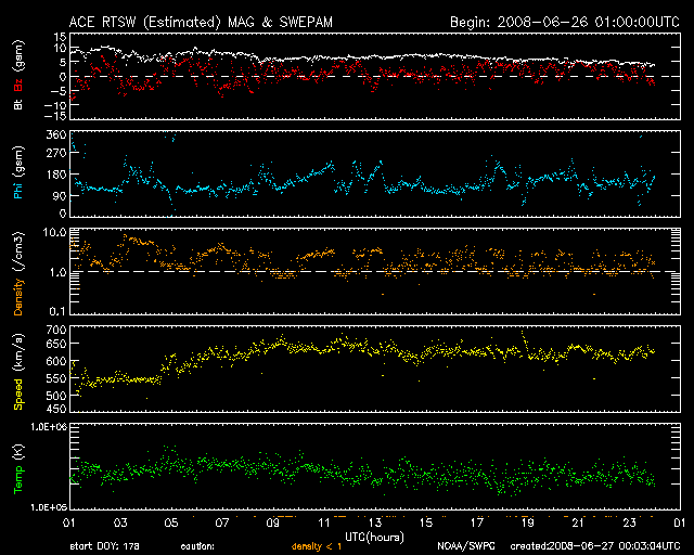 2008/ 6/27 09:04 更新 600km/秒台の高速太陽風が続いています。磁気圏活動も活発化しています。金星がLASCO C3から去りつつあります。 担当 篠原 SOHO LASCO C3の視野を横切っていた金星が、次第に東の端に近づいて来ました。 5月12日に、視野に見えて来たことをお伝えして以来、1ヶ月半をかけてここまで移動しました。 もうしばらくすると、左へ外れて行きます。 最後の姿をお楽しみください。 太陽風の速度は、600〜650km/秒へ上昇しています。 前周期と同程度の高速風になりました。 磁場強度は、ゆっくりと弱まる傾向が見えますが、まだ5nTを保っています。 高速風領域としては、勢いの盛んな中盤を迎えていると思われます。 ACEの図の磁場データは、縦軸が±15nTの幅になっているため、 変化が小さく見えてしまっています。 そのため、南北成分(赤線)は小さく振れている様に感じますが、 図の前半では、-5nT程度の十分な強さの南向きが頻繁に発生しています。 このため、磁気圏活動は活発化して、 AE指数で500nTから1000nTを超えるの中規模のオーロラ活動が、連続的に発生しています。 図の後半は、磁場の南北成分がどちらかというと北寄りに変わり、 磁気圏はやや穏やかになっています。 高速風は、今日明日と現状程度の高い速度を保つと思われます。 磁気圏も引き続き活動的な状態が続くでしょう。 ただし、磁場強度は次第に下がってくるので、活動の規模は次第に弱まって行きます。 SOHO EIT195を見てください。 コロナホールはかなり淡いのですが、分布の全体が西半球(右半分)に移動しています。 3日くらいすると、コロナホールの影響は弱まって来るでしょう。 放射線帯の高エネルギー電子は、現在はほとんど上昇していません。 高速風は続いているので、もうしばらく注視する必要があるでしょう。 太陽は無黒点で、とても穏やかです。 SOHO LASCO C3の視野を、金星が通過中です。だいぶ東側に移動しています。 (c) SOHO (ESA & NASA) ![]() SOHO EIT195による、太陽コロナの様子。27日9時(世界時27日0時)。 (c) SOHO (ESA & NASA) ![]() ACEが観測した太陽風の磁場(1番上の枠、白線は全体の強度、赤線は南北成分) および、太陽風の密度(3番目の橙線)、速度(4番目の黄線) (c) NOAA/SWPC ![]() リアルタイムAE指数 下段のAEグラフの値が高くなると、オーロラ活動が活発化しています。 (c) 京都大学, NICT ![]() シベリアで観測された3日間の磁場データ 右側の3分の1が、昨日のデータになります。グラフが上がったり下がったりすると、オーロラ活動が活発化しています。 (c) NICT ![]() 27日の太陽周期に合わせたデータプロット 太陽が同じ面を地球に向けていた27日前の変化から、今後を予想することができます。 (c) NICT