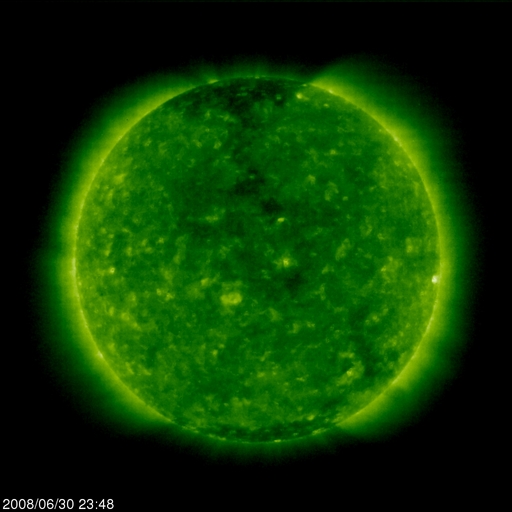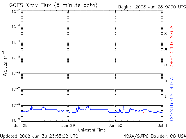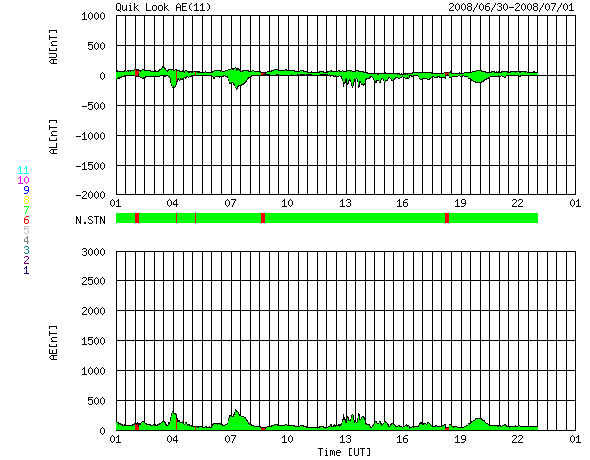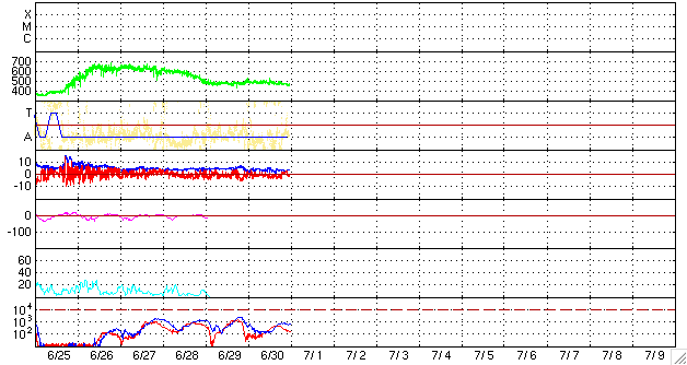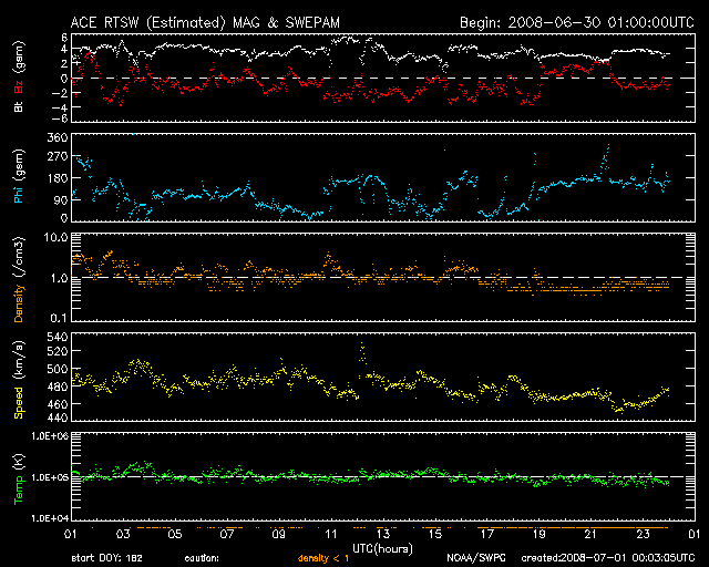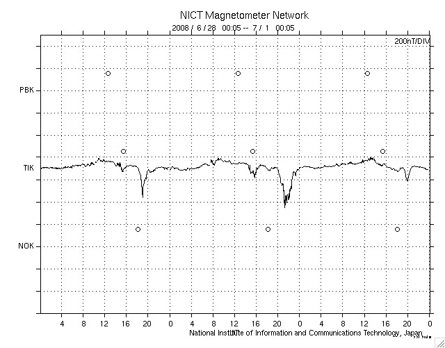 2008/ 7/ 1 09:05 更新 400km/秒台後半のやや速い太陽風が続いています。今後、低速風へ変わって行くでしょう。 担当 篠原 やや高速の太陽風が、安定して続いています。 速度は、480km/秒から、ゆっくりと460km/秒に下がりつつあります。 磁場強度は2-4nTと、こちらはやや弱めです。 27日周期の図を見ると、高速風の山が通り過ぎた後、 29日、30日と2日間にわたって、500km/秒弱の速度が安定して続いています。 前周期は、6月2日くらいから速度が下がり始め、低速風へと移行しました。 今周期も、今日以降同様の経過をたどると思われます。 磁気圏活動は、AE指数で200-300nTの小さな活動が見られる程度です。 速度が400km/秒台後半であること、磁場強度も弱めになっているため、 この程度の活動になっているのでしょう。 それでも、発生が続いているのは、太陽風の磁場が南寄りの傾向になっているためです。 今後、太陽風の速度が下がるとともに、磁気圏はより静穏になるでしょう。 SOHO EIT195の太陽コロナ写真を見ると、 コロナホールが、太陽の中心から北極に向かって伸びています。 昨日はとても淡く見えたのですが、 太陽の中心に来たため、今日はだいぶ見やすくなっています。 この様子だと、3日後の7月4日くらいから、太陽風に影響が見られそうです。 前周期は、500km/秒の風が2日続くという変化でした(6月7-8日)。 今回も、同程度ではないかと思います。 太陽は、今日も無黒点です。 新しい領域が上がって来る様子もなく、穏やかな状態が続きます。 SOHO EIT195による、太陽コロナの様子。1日8時半(世界時30日23時半)。 (c) SOHO (ESA & NASA) ![]() ACEが観測した太陽風の磁場(1番上の枠、白線は全体の強度、赤線は南北成分) および、太陽風の密度(3番目の橙線)、速度(4番目の黄線) (c) NOAA/SWPC ![]() リアルタイムAE指数 下段のAEグラフの値が高くなると、オーロラ活動が活発化しています。 (c) 京都大学, NICT ![]() シベリアで観測された3日間の磁場データ 右側の3分の1が、昨日のデータになります。グラフが上がったり下がったりすると、オーロラ活動が活発化しています。 (c) NICT ![]() 27日の太陽周期に合わせたデータプロット 太陽が同じ面を地球に向けていた27日前の変化から、今後を予想することができます。 (c) NICT