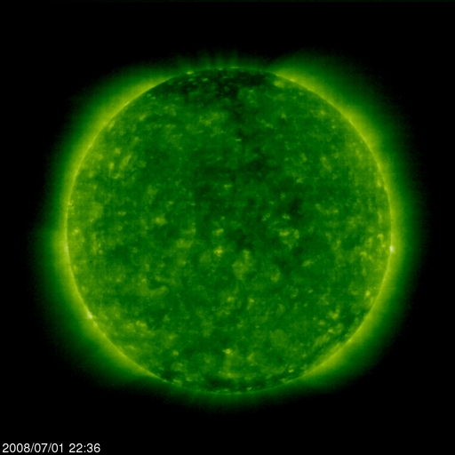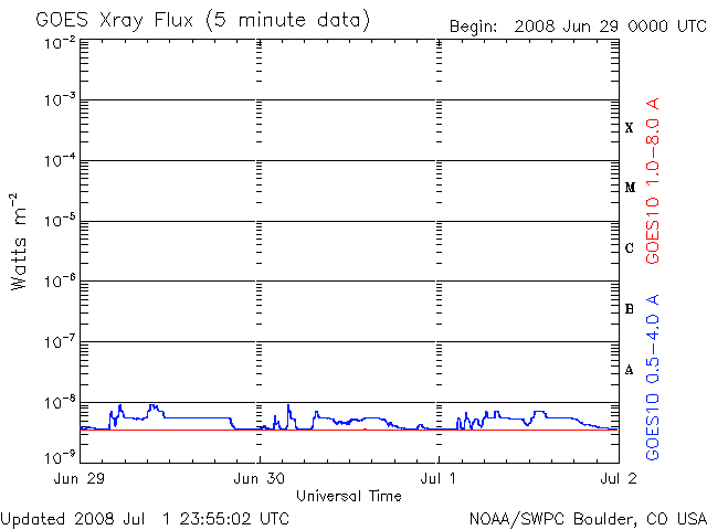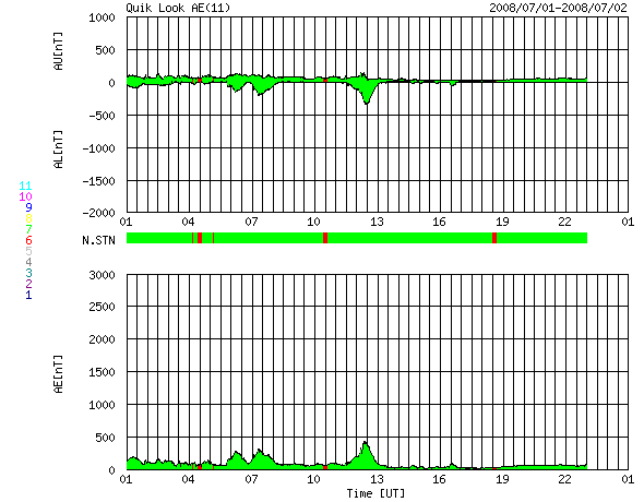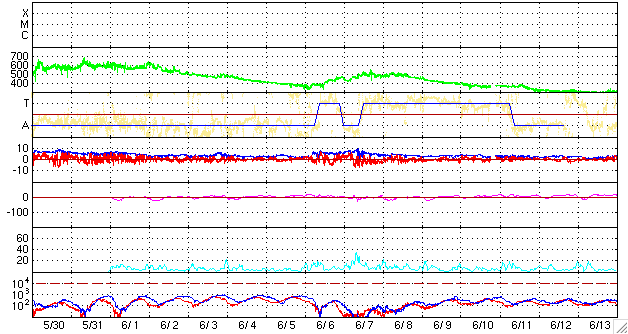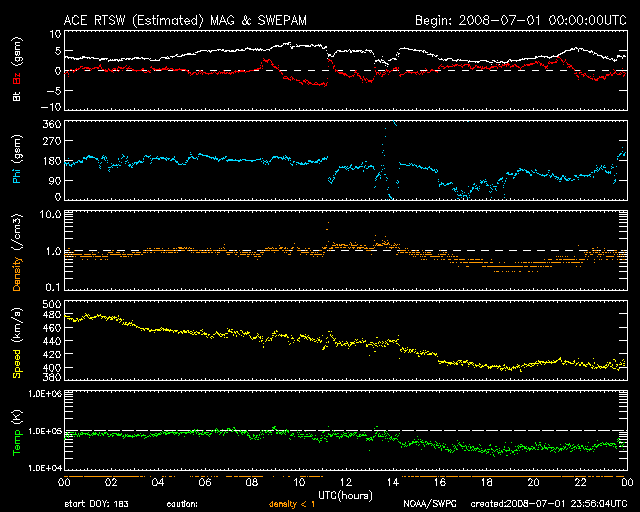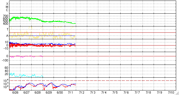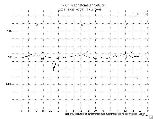 2008/ 7/ 2 09:02 更新 太陽風は通常の状態に戻りました(400km/秒)。磁気圏も穏やかです。 担当 篠原 太陽風の速度は、480km/秒から400km/秒へ下がりました。 太陽風は、普通の速度へ戻っています。 磁場強度は、2〜5nTの間を変化していますが、強さとしては普通の状態です。 磁気圏活動も、穏やかです。 AE指数では、300〜400nTの短時間の小規模活動が2つほど起きていますが、 その他はまったく平坦で、 太陽風の速度が下がったことで、磁気圏への影響は一層小さくなっています。 太陽風は、今日、明日と穏やかな状態が続くでしょう。 明日遅くか、明後日になると、 コロナホールによる小規模の乱れがやって来るかもしれません。 27日周期の図で、6月7-8日に見られた変化の回帰です。 前回の最高速度は、500km/秒を超えた程度です。 コロナホールは、SOHO EIT195の写真では、太陽の中心をやや通り過ぎています。 今日の写真では、中心を通り過ぎたことで既に見にくくなっています。 このように、今周期もコロナホールは弱く、やって来る太陽風の乱れも小規模でしょう。 太陽は、今日も黒点は見られません。 SOHO EIT195では、明るく光る領域も見られず、穏やかな太陽が続いています。 SOHO EIT195による、太陽コロナの様子。2日7時半(世界時1日22時半)。 (c) SOHO (ESA & NASA) ![]() ACEが観測した太陽風の磁場(1番上の枠、白線は全体の強度、赤線は南北成分) および、太陽風の密度(3番目の橙線)、速度(4番目の黄線) (c) NOAA/SWPC ![]() リアルタイムAE指数 下段のAEグラフの値が高くなると、オーロラ活動が活発化しています。 (c) 京都大学, NICT ![]() シベリアで観測された3日間の磁場データ 右側の3分の1が、昨日のデータになります。グラフが上がったり下がったりすると、オーロラ活動が活発化しています。 (c) NICT ![]() 27日の太陽周期に合わせたデータプロット 太陽が同じ面を地球に向けていた27日前の変化から、今後を予想することができます。 (c) NICT