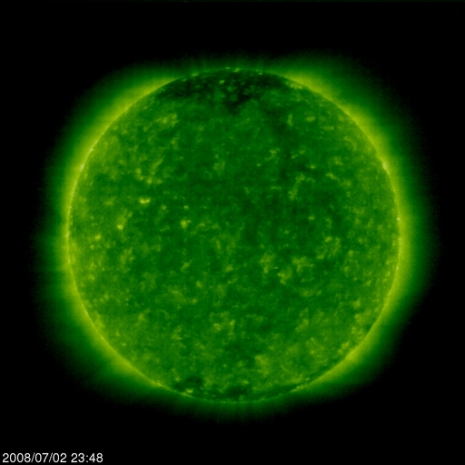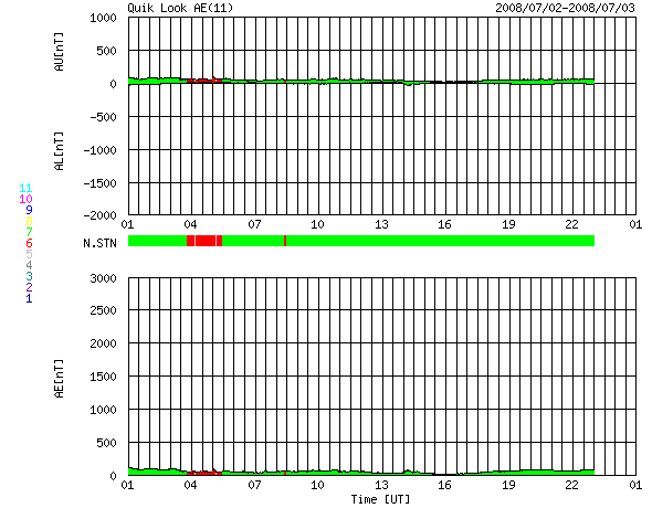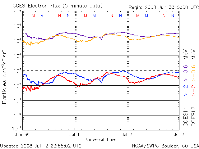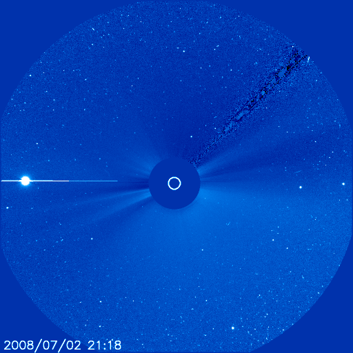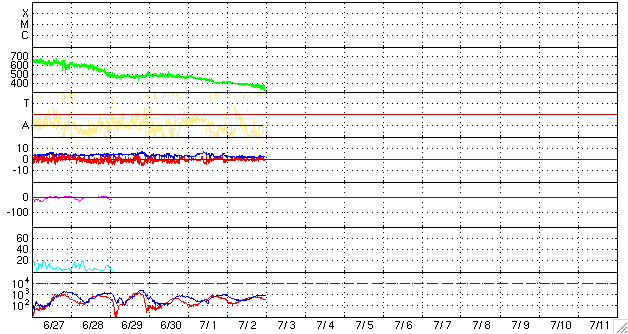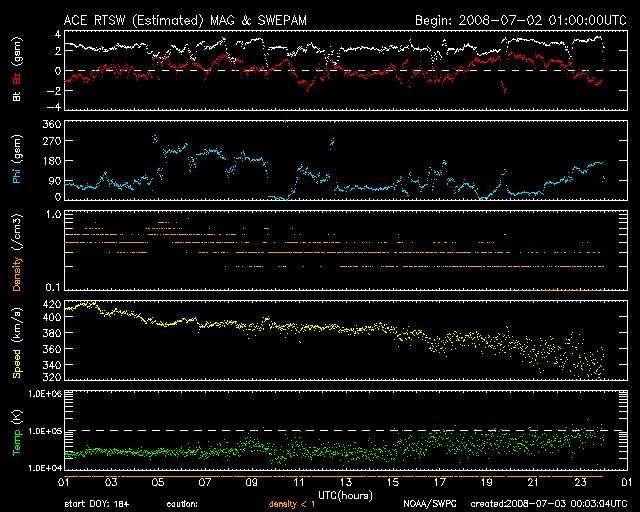 2008/ 7/ 3 09:04 更新 太陽風は低速になっています。磁気圏はとても静穏です。これから小規模の乱れがやって来そうです。 担当 篠原 今日の1枚目の写真は、SOHO LASCO C3です。 金星がいよいよ画面から外れようとしています。 この様子だと、来週には見えなくなってしまいそうです。 2ヶ月近く見え続けていたので、もう、あるのが普通という感覚になっていましたが、 もうすぐ太陽だけになってしまいます。 太陽風は、じわじわと速度を下げ、350km/秒の低速風になっています。 それとともに、プラズマの密度がどんどん減って、0.2個/cm^3くらいに下がっています。 このレベルになると、ACEの測定にも影響があり、観測値の誤差が大きくなります。 今日の図の後半を見ると、速度のデータが大きくばらつくようになっていますが、 これは密度が減少した影響だと思われます。 磁気圏の活動はとても静穏です。 AE指数は全く変化が見られません。 この穏やかな状態は今日までで、この後、小規模の太陽風の乱れがやって来そうです。 27日周期の図を参考にすると、今日の午後にでも磁場の乱れが始まり、 明日になると、速度が上昇を始めそうです。 前回の最高速度は、500km/秒とそれほどでもなく、期間も2日程度でした。 今回も同じくらいの乱れになるのではないかと思います。 この後のACEデータの変化に注目して下さい。 放射線帯高エネルギー電子は、穏やかな状態で安定しています。 次の高速風の影響ですが、前周期は規模が小さいかったため影響はありませんでした。 今回も、同程度の太陽風の変化であれば、問題はないでしょう。 太陽は黒点はなく、とても穏やかです。 SOHO LASCO C3の視野から、金星が去りつつあります。もう数日でしょう。 (c) SOHO (ESA & NASA) ![]() SOHO EIT195による、太陽コロナの様子。3日9時(世界時3日0時)。 (c) SOHO (ESA & NASA) ![]() ACEが観測した太陽風の磁場(1番上の枠、白線は全体の強度、赤線は南北成分) および、太陽風の密度(3番目の橙線)、速度(4番目の黄線) (c) NOAA/SWPC ![]() リアルタイムAE指数 下段のAEグラフの値が高くなると、オーロラ活動が活発化しています。 (c) 京都大学, NICT ![]() シベリアで観測された3日間の磁場データ 右側の3分の1が、昨日のデータになります。グラフが上がったり下がったりすると、オーロラ活動が活発化しています。 (c) NICT ![]() 27日の太陽周期に合わせたデータプロット 太陽が同じ面を地球に向けていた27日前の変化から、今後を予想することができます。 (c) NICT
