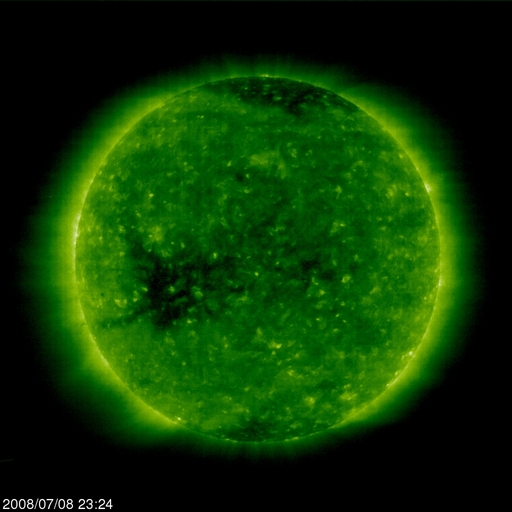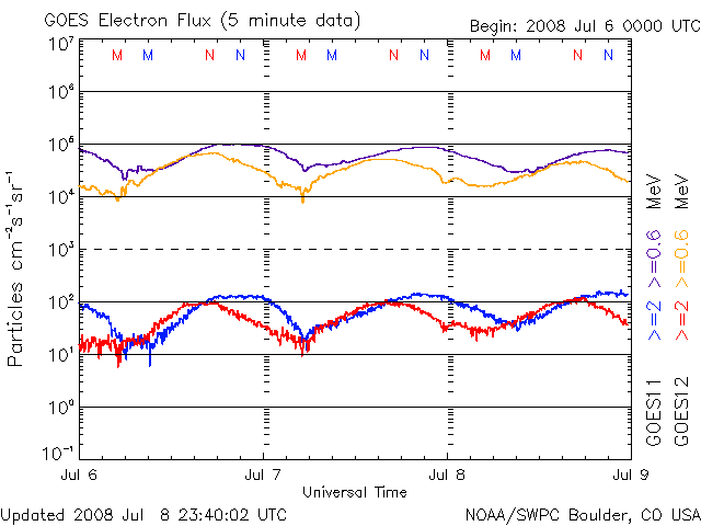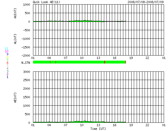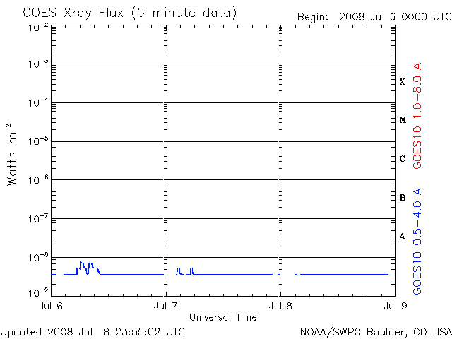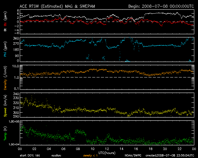 2008/ 7/ 9 09:01 更新 太陽風速度は300km/秒に下がり、かなりの低速風になっています。磁気圏はとても静かです。 担当 篠原 2008年6月までの太陽活動の推移です。 どうぞご覧下さい。 現在の太陽活動 --2008年前半を終えて-- 穏やかな宇宙天気が続いています。 太陽風は、速度が300km/秒まで下がり、低速の状態が一段と深まっています。 磁場強度も、3nT前後と弱めの状態が続いています。 このため、磁気圏もとても静かで、 AE指数には全く変化が見られません。 シベリア磁場データも、3日間にわたって静かな状態が続いています。 この穏やかな状態は、もう2-3日続きます。 次の高速風は、11-12日にやって来ると予想されます。 その発生源のコロナホールは、次第に太陽の中心に進んできました。 SOHO EIT195の太陽コロナ写真を見てください。 今回のコロナホールは、東西に長く、 後半ほど、コロナホールの幅が広がっています。 従って、高速風は、今回も1週間にわたって続き、 しかも、後半により強い山がやってくるかもしれません。 太陽は今日も無黒点で、非常に静穏です。 SOHO EIT195による、太陽コロナの様子。9日8時半(世界時8日23時半)。 (c) SOHO (ESA & NASA) ![]() ACEが観測した太陽風の磁場(1番上の枠、白線は全体の強度、赤線は南北成分) および、太陽風の密度(3番目の橙線)、速度(4番目の黄線) (c) NOAA/SWPC ![]() リアルタイムAE指数 下段のAEグラフの値が高くなると、オーロラ活動が活発化しています。 (c) 京都大学, NICT ![]() シベリアで観測された3日間の磁場データ 右側の3分の1が、昨日のデータになります。グラフが上がったり下がったりすると、オーロラ活動が活発化しています。 (c) NICT ![]() SOHO衛星のMDIカメラによる太陽黒点 (c) SOHO (ESA & NASA) ![]() GOES衛星の太陽X線データ (c) NOAA/SWPC ![]() GOES衛星による、静止衛星軌道における高エネルギー電子の変化 (c) NOAA/SWPC ![]() | |||||||||||||||||||||||||||||||||||||||||||||||||||||||||||||||||||||||||||||||||||||||||||||||||||||||||||||||||||||||||||||||||||||||||||||||||||||||||||||||||||||||||||||||||||||||||