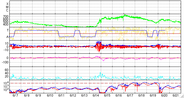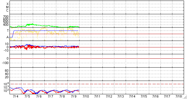 ACEが観測した太陽風の磁場(1番上の枠、白線は全体の強度、赤線は南北成分) および、太陽風の密度(3番目の橙線)、速度(4番目の黄線) (c) NOAA/SWPC ![]() シベリアで観測された3日間の磁場データ 右側の3分の1が、昨日のデータになります。グラフが上がったり下がったりすると、オーロラ活動が活発化しています。 (c) NICT ![]() 27日の太陽周期に合わせたデータプロット 太陽が同じ面を地球に向けていた27日前の変化から、今後を予想することができます。 (c) NICT