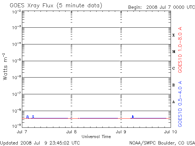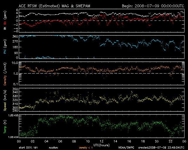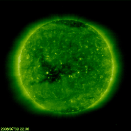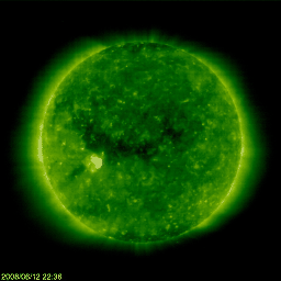 2008/ 7/10 08:50 更新 低速で穏やかな太陽風が続いています。明日以降、高速風が始まりそうです。 担当 篠原 今日も宇宙天気はとても穏やかです。 太陽風は、速度320km/秒と低速状態で安定しています。 27日周期の図の緑色の線を見てください。 図の初め(7月4日)からずっと、下の端をはう様に低速に留まっています。 穏やかな太陽風が続いています。 太陽風の磁場強度も、3nTと弱まった状態です。 磁気圏活動もとても静穏です。 シベリア磁場データを見ると、3日間全く変化がなく、 グラフは、同じゆるやかな曲線が、3回繰り返されているだけです。 この静かな状態は、今日から明日くらいまで続きそうです。 SOHO EIT195では、コロナホールが太陽のまん中に大きく広がって見えています。 27日前の写真(右)と比較してください。 コロナホールの位置はほとんど変化がありません。 6月12日の写真には、明るい活動的な領域がひとつ見えますが、 現在は明るい部分は消えて、その分、コロナホールが広がって見えます。 これからやって来る高速の太陽風は、前周期と類似した展開になるでしょう。 27日周期の図で回帰を予想すると、明日の夜くらいから変化が始まりそうです。 初めに太陽風の磁場強度が大きくなり、遅れて速度の上昇が始まります。 磁場が強まって、大きく南を向くと、磁気圏活動が活発化するでしょう。 北極は白夜のため、まだライブカメラでオーロラの姿を見ることはできませんが、 AE指数やシベリア磁場データ、 あるいは、こちらの現在のオーロラオーバルの図などを使って、 磁気圏の動きを測ってください。 太陽は黒点はなく、とても静穏です。 X線のグラフも最低レベルを推移しています。 SOHO衛星のEIT195カメラの映像 (c) SOHO (ESA & NASA)