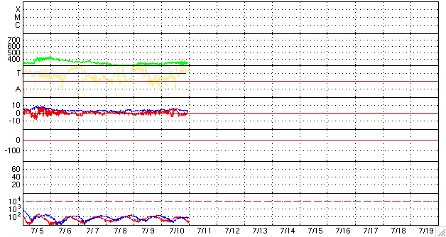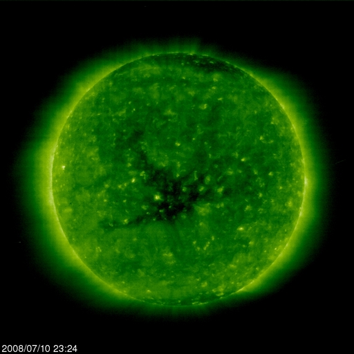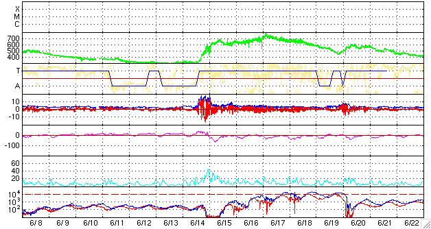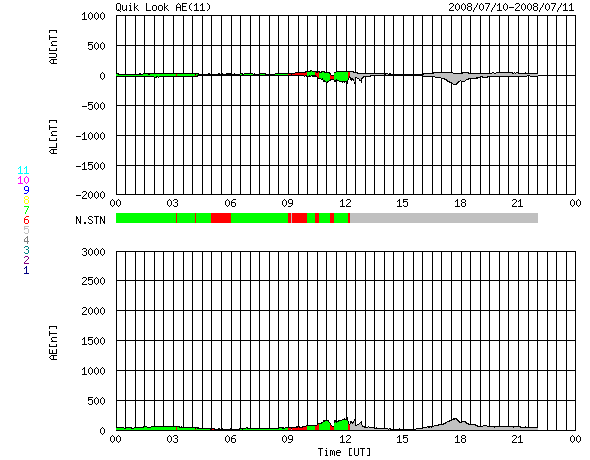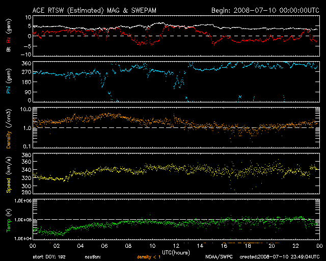 2008/ 7/11 08:52 更新 340km/秒の低速の太陽風が続いています。これから高速風がやって来るでしょう。 担当 篠原 SOHO EIT195の太陽コロナ写真を見てください。 コロナガスを切り裂いた様なコロナホールが、太陽の中央に大きく見えています。 コロナホールは、 太陽の固有磁場が宇宙空間へ向かって大きく広がっている領域にできます。 外側へ向かって広がる磁力線に沿って、コロナのガスがどんどん飛び出すため、 ガスが周囲よりも希薄になり、穴の様に見えるのです。 飛び出したガスは、高速の太陽風を作ります。 コロナホールが太陽の中心に見えるとき、 コロナガスは地球へ向かって噴き出しています。 地球までは約3日の道のりです。 現在、ちょうど中心に来ているので、 これから3日後、14日頃に高速風が最も強い状態になると考えられます。 高速風の到来は、コロナホールの先頭(右端)の位置で読み取ります。 既に脇へ行っているため、先頭の部分は見にくくなっていますが、 そろそろ西側(右側)の半分くらいに達します。 ここが、地球へ高速風がやってくるタイミングを測るための目安の位置です。 今日あたりから高速太陽風が始まるでしょう。 27日周期の図の予想では、今夜になるかもしれません。 現在の太陽風は、速度が340km/秒と、少し上がったものの低速状態です。 磁場強度は、4-5nTで、こちらは普通の強さです。 太陽風が穏やかなので、磁気圏も静穏です。 AE指数では、200nTの小さな変化が2回起こっています。 太陽風磁場が、南向きになった時間帯と一致しています。 今後、高速風が近づくと、太陽風の磁場が強まります。 この時に、大きく南を向いて、磁気圏を一気に活動的にしたりします。 高速風の立ち上がりに、特に注意してください。 今回の高速風は、前回は最高速度が750km/秒、7日間にわたって続きました。 今回も、同程度の変動が見られるでしょう。 今日も、太陽には黒点はありません。 静穏な状態が続いています。 SOHO EIT195による、太陽コロナの様子。11日8時半(世界時10日23時半)。 (c) SOHO (ESA & NASA) ![]() ACEが観測した太陽風の磁場(1番上の枠、白線は全体の強度、赤線は南北成分) および、太陽風の密度(3番目の橙線)、速度(4番目の黄線) (c) NOAA/SWPC ![]() リアルタイムAE指数 下段のAEグラフの値が高くなると、オーロラ活動が活発化しています。 (c) 京都大学, NICT ![]() シベリアで観測された3日間の磁場データ 右側の3分の1が、昨日のデータになります。グラフが上がったり下がったりすると、オーロラ活動が活発化しています。 (c) NICT ![]() 27日の太陽周期に合わせたデータプロット 太陽が同じ面を地球に向けていた27日前の変化から、今後を予想することができます。 (c) NICT