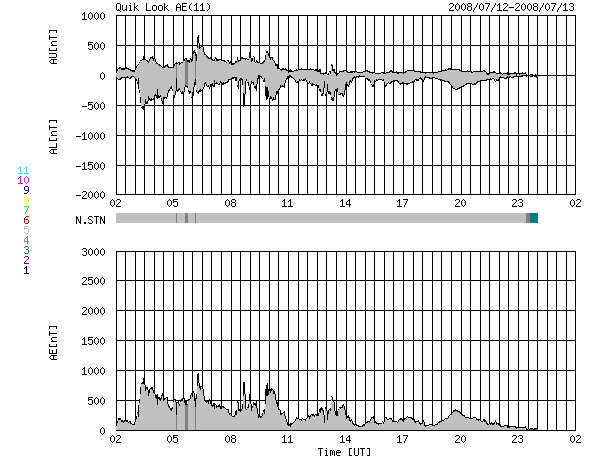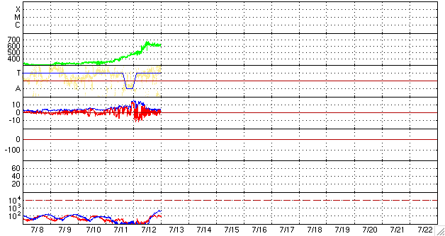 ACEが観測した太陽風の磁場(1番上の枠、白線は全体の強度、赤線は南北成分) および、太陽風の密度(3番目の橙線)、速度(4番目の黄線) (c) NOAA/SWPC ![]() リアルタイムAE指数 下段のAEグラフの値が高くなると、オーロラ活動が活発化しています。 (c) 京都大学, NICT ![]() シベリアで観測された3日間の磁場データ 右側の3分の1が、昨日のデータになります。グラフが上がったり下がったりすると、オーロラ活動が活発化しています。 (c) NICT ![]() 27日の太陽周期に合わせたデータプロット 太陽が同じ面を地球に向けていた27日前の変化から、今後を予想することができます。 (c) NICT