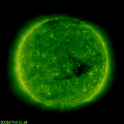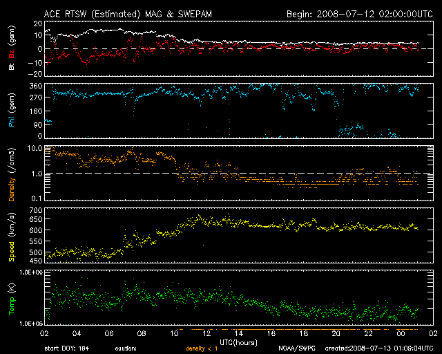 2008/ 7/13 10:14 更新 太陽風の速度は、600km/秒台へ上昇しています。磁気圏も活動的になっています。 担当 篠原 昨日のニュースのすぐ後から、 太陽風磁場の南北成分が、南寄りに傾向が変わりました。 磁場強度が10nTを超える強さにあったため、 南向きの磁場は、-5〜-10nTと強めになりました。 その影響で、磁気圏活動が活発化し、 AE指数で500〜800nTの中規模変動が続いています(AEの図の前半)。 そして、昨夜、12日16時(世界時12日7時)から、速度が再び上昇を始め、 12日20時(世界時12日11時)には650km/秒近くまで上がりました。 現在はやや下がって、600km/秒くらいになっています。 ただし、速度が上がるとともに、磁場強度は急速に弱まり、 5nTレベルに落ち着いています。 南北成分も0nT付近に停滞し、磁気圏の活動は弱まっています。 速度が高いので、AE指数では200〜400nTの小規模活動は起こっていますが、 AE指数の後半は、前半と比べると穏やかな印象になっています。 SOHO EIT195を見ると、コロナホールの最も濃い部分は、 これから地球への影響開始位置に達します。 従って、速度はもう一段上昇する可能性があります。 27日周期の図を見ても、前周期の最高速度は6月17日に発生しており、 これは、今周期では、明日、7月14日に相当します。 太陽風の変化に対し、引き続き注意が必要でしょう。 放射線帯の高エネルギー電子は、 太陽風の速度の上昇によって、多少増加していますが、 まだ、たいしたレベルではありません。 今後、更に増加する可能性があるので、注意が必要です。 太陽は黒点はなく、非常に静穏です。 無黒点の状態は、20日にわたって続いています。 SOHO衛星のEIT195カメラの映像 (c) SOHO (ESA & NASA)