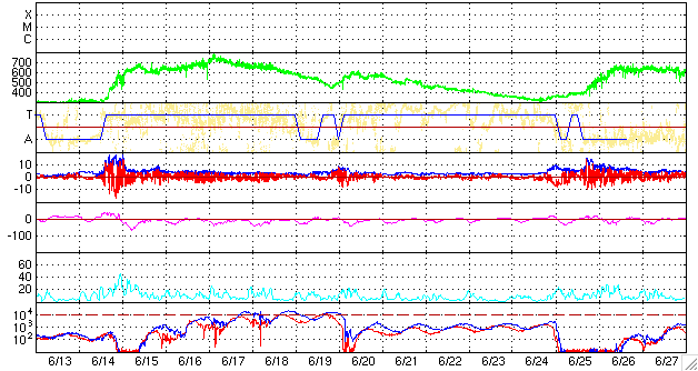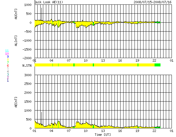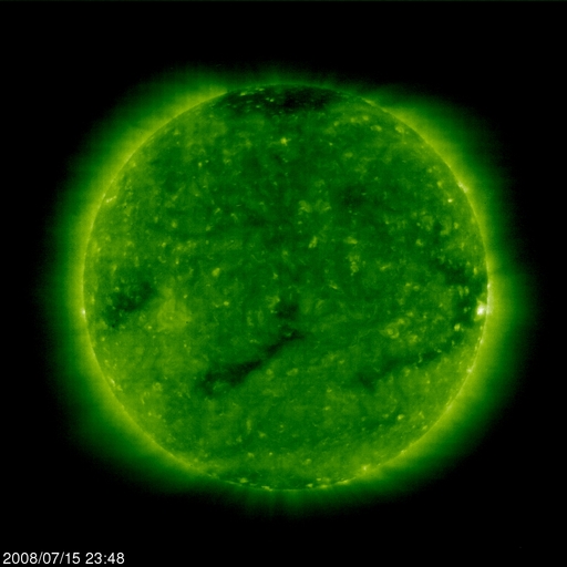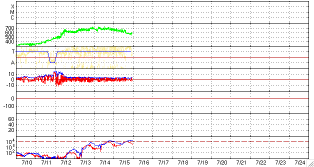 2008/ 7/16 09:04 更新 高速太陽風は後半に入り、速度が下がり始めました。もうしばらく高速状態が続くでしょう。 担当 篠原 高速太陽風は、最高速度の領域を超え、ゆっくりと速度の低下が始まっています。 昨日は、700km/秒近い速度がありましたが、 1日経った現在は、550-600km/秒に下がっています。 まだ、速度としては、十分高速の状態です。 磁場強度は、3nTほどとやや弱まった状態で安定しています。 27日周期の図を見ると、速度の下がり方も前周期の変化とよく似ています。 AE指数によると、磁気圏活動は、図の前半で300nTくらいの小規模変動が見られ、 後半は静穏に変わっています。 太陽風磁場の南向き成分の変化が、より効いているのですが、 速度が下がっていることも、活動を弱める原因となっているでしょう。 太陽風の速度は下がり始めましたが、このまますぐに低速風にはならず、 明日くらいにもう一山やってくる可能性があります。 27日周期の図で、6月20日に見えている速度の盛り上がりです。 この時は、一時的に600km/秒まで回復しています。 今回はどうなるでしょうか。 また、SOHO EIT195の太陽コロナ写真では、 太陽の中心に細長いコロナホールが見えています。 前周期はほとんど見えていなかったコロナホールで、 この変化による太陽風の変化も今後注目されます。 放射線帯高エネルギー電子は、増加は止まり、 警戒レベルに達したところで安定しています。 衛星の運用などでは注意が必要です。 高エネルギー電子は、明日の太陽風の変化で大きく減少する可能性があります。 太陽は無黒点で、とても穏やかです。 SOHO EIT195による、太陽コロナの様子。16日0時半(世界時15日23時半)。 (c) SOHO (ESA & NASA) ![]() ACEが観測した太陽風の磁場(1番上の枠、白線は全体の強度、赤線は南北成分) および、太陽風の密度(3番目の橙線)、速度(4番目の黄線) (c) NOAA/SWPC ![]() リアルタイムAE指数 下段のAEグラフの値が高くなると、オーロラ活動が活発化しています。 (c) 京都大学, NICT ![]() シベリアで観測された3日間の磁場データ 右側の3分の1が、昨日のデータになります。グラフが上がったり下がったりすると、オーロラ活動が活発化しています。 (c) NICT ![]() 27日の太陽周期に合わせたデータプロット 太陽が同じ面を地球に向けていた27日前の変化から、今後を予想することができます。 (c) NICT