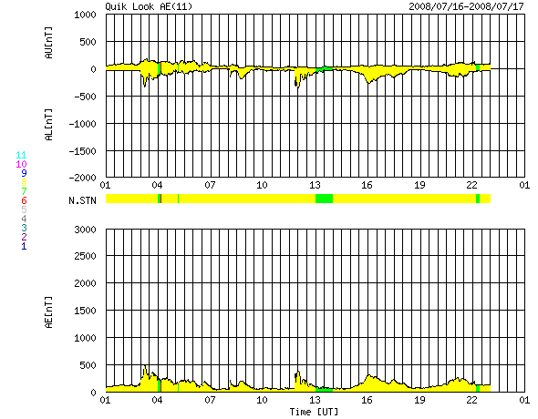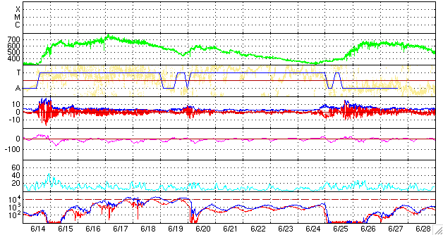 ACEが観測した太陽風の磁場(1番上の枠、白線は全体の強度、赤線は南北成分) および、太陽風の密度(3番目の橙線)、速度(4番目の黄線) (c) NOAA/SWPC ![]() リアルタイムAE指数 下段のAEグラフの値が高くなると、オーロラ活動が活発化しています。 (c) 京都大学, NICT ![]() シベリアで観測された3日間の磁場データ 右側の3分の1が、昨日のデータになります。グラフが上がったり下がったりすると、オーロラ活動が活発化しています。 (c) NICT ![]() 27日の太陽周期に合わせたデータプロット 太陽が同じ面を地球に向けていた27日前の変化から、今後を予想することができます。 (c) NICT
