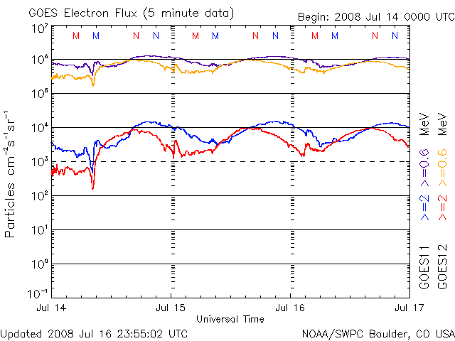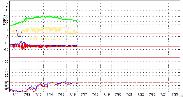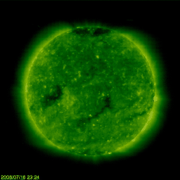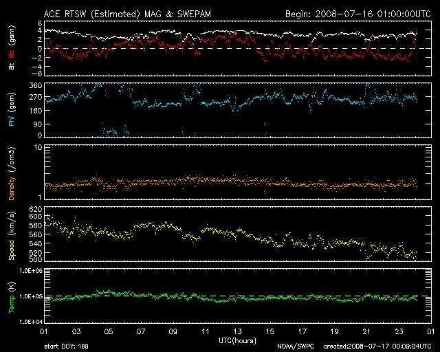 2008/ 7/17 09:11 更新 太陽風の速度は、500km/秒近くまで下がって来ました。小規模の磁気圏が続いています。 担当 篠原 太陽風の速度は、ゆっくりと下がっています。 昨日は550-600km/秒程度でしたが、現在は520km/秒に下がっています。 磁場強度は、3nTに弱まったままです。 高速太陽風は、終盤の雰囲気です。 磁気圏では、小規模のオーロラ活動が断続的に発生しています。 AE指数で、300nTほどの変動が、数時間おきに起こっています。 シベリア磁場データを見ると、3日前は変動幅が大きかったのですが、 後の2日間は変化が小さくなっています。 高速風の弱まりとともに、磁気圏が次第に穏やかになっている様子が分かります。 さて、今後の展開ですが、 27日周期の図を見ると、前周期の6月20日に、小さな高速風の山が来ています。 この回帰があるとすると、今日になります。 一方、SOHO EIT195では、太陽の中心やや南(下)に、細長いコロナホールが見えています。 このコロナホールの位置は、太陽の中心線をやや過ぎた程度で、 地球への影響開始位置までは、もう2日ほどかかりそうです。 このコロナホールは、前周期には見られず、太陽が1回転する間に現れたものです。 この2つの状況から、太陽風の速度が、 もう一度盛り上がる可能性があると考えているのですが、 それは、今日になるのでしょうか、もう少し遅れるのでしょうか、注目してください。 SOHO EIT195には、東側(左側)に、次のコロナホールが見えています。 こちらは、6日後くらいから地球に影響を及ぼすでしょう。 放射線帯の高エネルギー電子は、10,000の警戒レベルを保っています。 引き続き注意が必要です。 太陽は無黒点の状態が続いています。 6月23日以降、24日間にわたって黒点がありません。 SOHO衛星のEIT195カメラの映像 (c) SOHO (ESA & NASA)