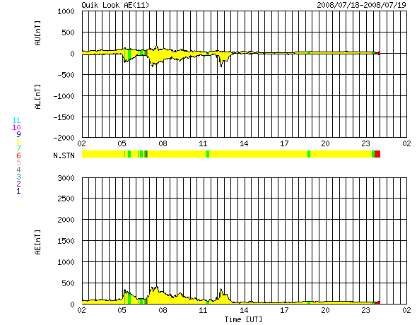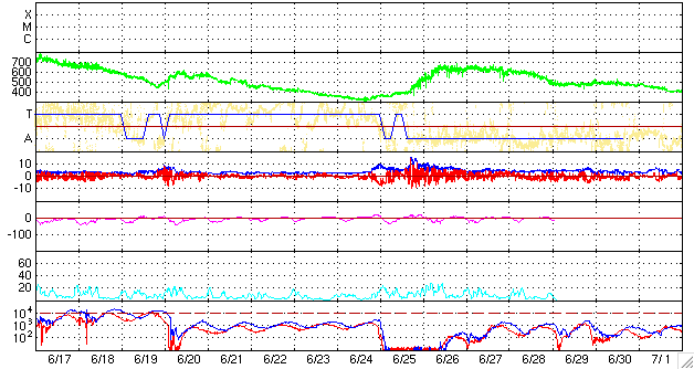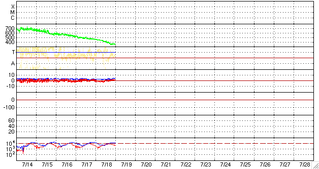 GOES衛星の太陽X線データ (c) NOAA/SWPC ![]() ACEが観測した太陽風の磁場(1番上の枠、白線は全体の強度、赤線は南北成分) および、太陽風の密度(3番目の橙線)、速度(4番目の黄線) (c) NOAA/SWPC ![]() リアルタイムAE指数 下段のAEグラフの値が高くなると、オーロラ活動が活発化しています。 (c) 京都大学, NICT ![]() シベリアで観測された3日間の磁場データ 右側の3分の1が、昨日のデータになります。グラフが上がったり下がったりすると、オーロラ活動が活発化しています。 (c) NICT ![]() 27日の太陽周期に合わせたデータプロット 太陽が同じ面を地球に向けていた27日前の変化から、今後を予想することができます。 (c) NICT