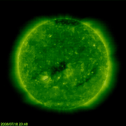 2008/ 7/19 10:24 更新 久しぶりに黒点が出現しました。太陽風は低速になり、磁気圏も静穏です。 担当 篠原 太陽の南東(左下)寄りに、小さな黒点が出現しました。 NOAAの群番号でちょうど1000番の黒点群です。 ただし、この群番号は、2002年6月に10000に達していて、 以降、10000を省略した数字を記すことが多くなっています。 ですので、今回の黒点群も、正確な番号は11000番です。 1枚めに掲載している、SOHOの可視光写真を見てください。 点がひとつだけの、とても小さな黒点群です。 分かりにくいでしょうから、2枚目の磁場写真も見てください。 こちらを見ると、[白 黒]とならんだ、磁場の強まりがはっきり分かります。 磁場の極性は、これまでの活動周期、第23期の性質です。 出現した場所も、南半球の低緯度(-10度ほど)で、 前の周期に属する黒点群と考えられます。 黒点の出現は6月22日以来です。 無黒点の日は25日間にわたって続きました。 太陽風は、どんどん速度が下がっています。 一気に340km/秒まで下がり、低速の太陽風に変わっています。 磁場強度も3nTを前後する程度で、穏やかな状態です。 SOHO EIT195に見えていた、細長いコロナホールの影響は、 今のところ、全く見られません。 このまま静かに過ぎて行くのか、これから多少の乱れがやってくるのか、 もうしばらく注目してください。 速度は下がっていますが、ACEの図の前半で、 磁場南北成分が、振幅は小さいもののずっと南向きになっていました。 このため、AE指数で300nTほどの小規模変動が発生しています。 南向きが終わった後半は、AE指数も静穏に変わっています。 SOHO EIT195では、次のコロナホールが太陽の中心に達しています。 これから3日間のカウントダウンです。 22日くらいから次の太陽風の乱れが始まるでしょう。 放射線帯高エネルギー電子は、ぎりぎりで警戒レベルを保っています。 減少はゆっくりです。 警戒状態はもうしばらく続きます。 SOHOによる太陽の可視光写真。太陽の南東(左下)寄りに、黒点が現れています。18日23時半(世界時18日14時半) (c) SOHO (ESA & NASA) ![]() SOHOによる太陽の磁場写真。黒点のある場所に磁場の強まりが見えます。19日0時(世界時18日15時) (c) SOHO (ESA & NASA) ![]() SOHO衛星のEIT195カメラの映像 (c) SOHO (ESA & NASA)
