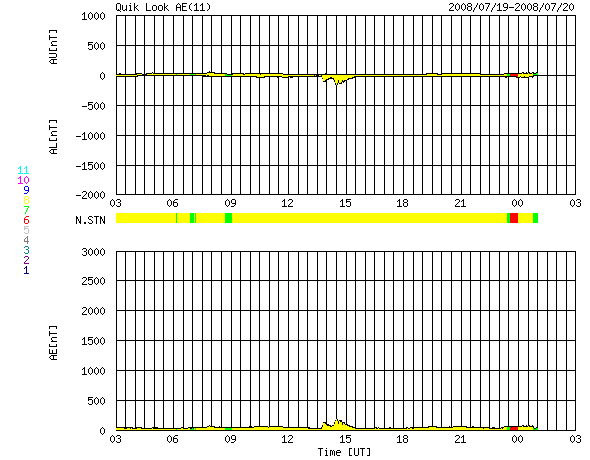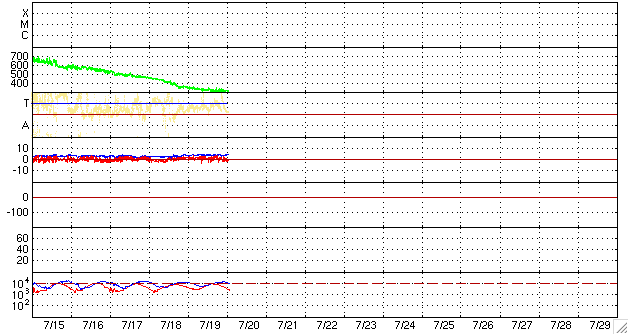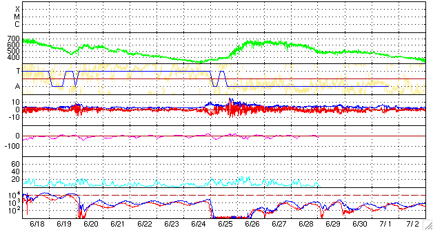 ACEが観測した太陽風の磁場(1番上の枠、白線は全体の強度、赤線は南北成分) および、太陽風の密度(3番目の橙線)、速度(4番目の黄線) (c) NOAA/SWPC ![]() リアルタイムAE指数 下段のAEグラフの値が高くなると、オーロラ活動が活発化しています。 (c) 京都大学, NICT ![]() シベリアで観測された3日間の磁場データ 右側の3分の1が、昨日のデータになります。グラフが上がったり下がったりすると、オーロラ活動が活発化しています。 (c) NICT ![]() 27日の太陽周期に合わせたデータプロット 太陽が同じ面を地球に向けていた27日前の変化から、今後を予想することができます。 (c) NICT