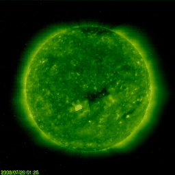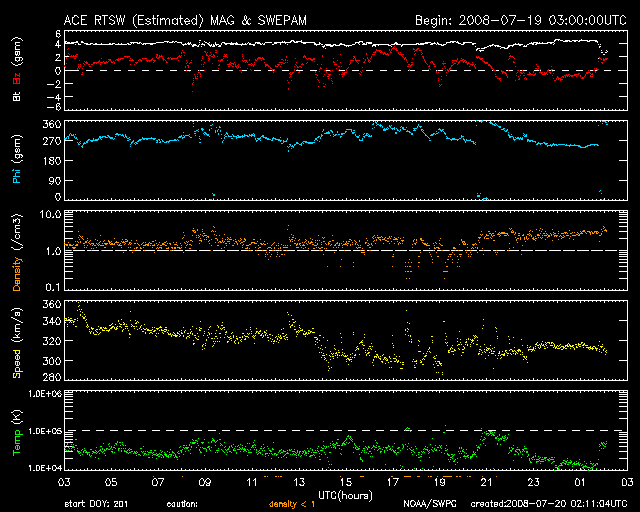 2008/ 7/20 11:11 更新 太陽風の速度は320km/秒に下がり、低速で穏やかです。 担当 篠原 太陽風は、速度が320km/秒まで下がっています。 かなり低速の状態です。 前の周期に見られた速度の山は、完全に消え、穏やかな太陽風が続いています。 コロナホールとしては、今周期の方が前周期よりもはっきりしていたのですが、 地球へは、影響が及ばなくなってしまったようです。 磁場強度は4nTに少し上がり、通常の強度にもどっています。 地球の磁気圏はとても穏やかです。 AE指数には、ほとんど変化が見られません。 この穏やかな状態は、2日ほど続くでしょう。 太陽の中心には、次の高速風をもたらすコロナホールが見えています。 昨日、中心線に達して、地球方向へ噴き出した高速の太陽風が、 こちらへ向かっているところです。 高速風は、3日程度で地球へ届きます。 従って、到来の予想が明後日頃となるのです。 前周期の高速風は、6月25日から始まっています。 最高速度は650km/秒で、高速状態は6日間ほど続いています。 放射線帯の高エネルギー電子は、警戒レベルを保っています。 このまま明後日まで高い状態が続きそうです。 太陽では、1000黒点群が中心やや南に見えています。 黒点は1つ見える程度で、太陽の活動は静穏です。 SOHOによる太陽の可視光写真。太陽の南(下)寄りに、1000黒点群があります。20日9時(世界時20日0時) (c) SOHO (ESA & NASA) ![]() SOHO衛星のEIT195カメラの映像 (c) SOHO (ESA & NASA)