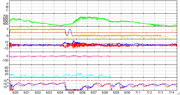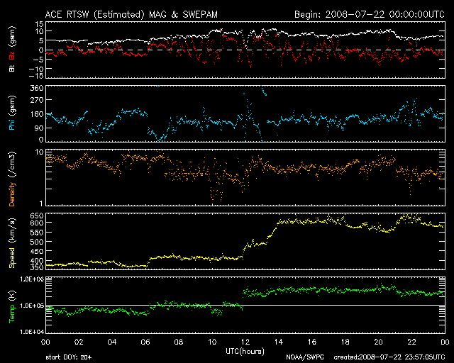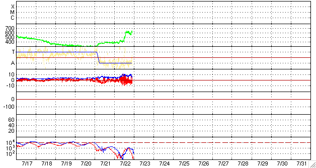 2008/ 7/23 09:02 更新 高速太陽風が到来しました。速度は600km/秒に上がっていますが、磁気圏はそれほど乱れていません。 担当 篠原 コロナホールによる高速の太陽風がやって来ました。 昨夜、22日21時(世界時22日12時)から、 太陽風の速度は、500km/秒、600km/秒と、2段階で上昇しています。 現在も、600km/秒を前後しながら、高速状態が続いています。 速度の上昇に先立って、太陽風の磁場強度は10nTまで強まりました。 速度が上がった現在も、磁場強度は弱まっていません。 5〜10nTの間で変化しています。 このことから、高速風は引き続き600km/秒台を保ちそうです。 太陽風の速度は上がりましたが、磁気圏活動はあまり強まっていません。 AE指数で300nTの小規模変動が、連続して発生している程度です。 ACEの図を見ると、-5nTくらいの南向き磁場が現れているのですが、 それほどの活動にはつながっていません。 27日周期の図を見ると、高速太陽風は、前周期より半日ほど早まっています。 高速風は、これから2〜3日程度続くのではないでしょうか。 前周期は、その後も500km/秒の太陽風が2日ほど続きました。 今回も同様に後に残るのかどうか、注目しています。 その後は、10日くらいにわたって、静穏な状態が続きます。 SOHO EIT195の写真でも、太陽の東半分(左側)には、 次のコロナホールは見られません。 放射線帯高エネルギー電子は、 太陽風の乱れが始まって、ややレベルを下げています。 この後増加に転じる可能性がありますので、今後の変化に注目してください。 太陽は無黒点です。 また無黒点の日が長く続くのでしょうか。 SOHO EIT195による、太陽コロナの様子。23日8時半(世界時22日23時半)。 (c) SOHO (ESA & NASA) ![]() ACEが観測した太陽風の磁場(1番上の枠、白線は全体の強度、赤線は南北成分) および、太陽風の密度(3番目の橙線)、速度(4番目の黄線) (c) NOAA/SWPC ![]() リアルタイムAE指数 下段のAEグラフの値が高くなると、オーロラ活動が活発化しています。 (c) 京都大学, NICT ![]() シベリアで観測された3日間の磁場データ 右側の3分の1が、昨日のデータになります。グラフが上がったり下がったりすると、オーロラ活動が活発化しています。 (c) NICT ![]() 27日の太陽周期に合わせたデータプロット 太陽が同じ面を地球に向けていた27日前の変化から、今後を予想することができます。 (c) NICT