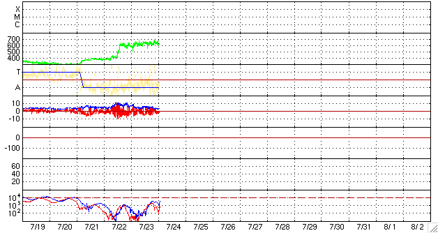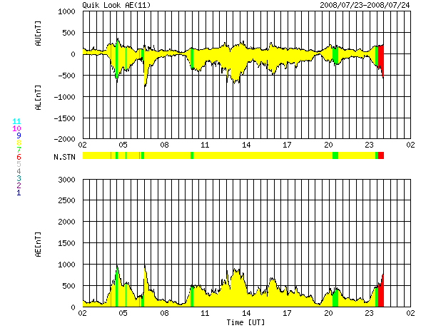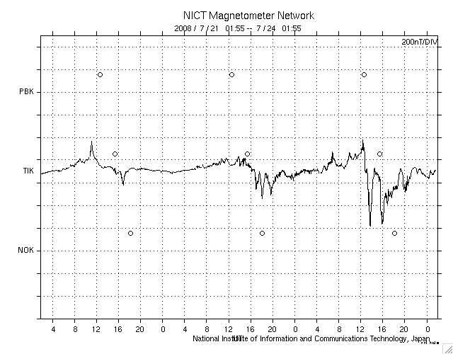 ACEが観測した太陽風の磁場(1番上の枠、白線は全体の強度、赤線は南北成分) および、太陽風の密度(3番目の橙線)、速度(4番目の黄線) (c) NOAA/SWPC ![]() リアルタイムAE指数 下段のAEグラフの値が高くなると、オーロラ活動が活発化しています。 (c) 京都大学, NICT ![]() シベリアで観測された3日間の磁場データ 右側の3分の1が、昨日のデータになります。グラフが上がったり下がったりすると、オーロラ活動が活発化しています。 (c) NICT ![]() 27日の太陽周期に合わせたデータプロット 太陽が同じ面を地球に向けていた27日前の変化から、今後を予想することができます。 (c) NICT
