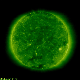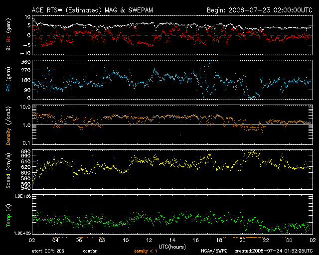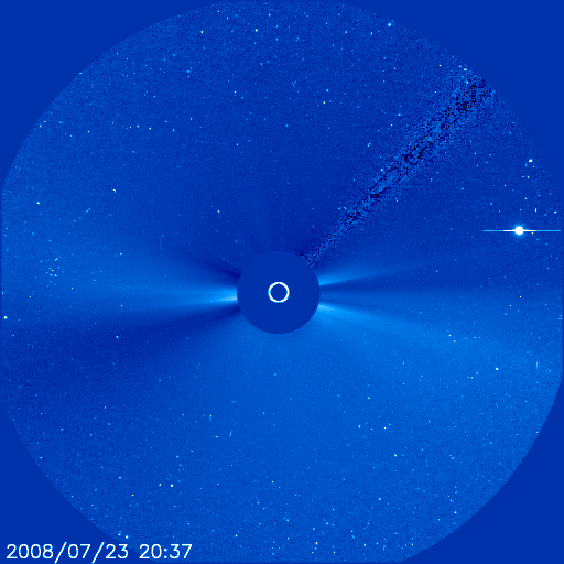2008/ 7/24 10:55 更新 600km/秒台の高速太陽風が続いています。磁気圏活動も活発です。LASCO C3で、プレセペが見えています。 担当 篠原 SOHO衛星LACSO C3カメラの視野に、水星とプレセペ星団が見えて来ました。 水星は、これから視野を左へ横切って行きます。 一方、プレセぺ星団は、視野を右へ動いて行きます。 プレセペ星団は、5月のすばると同様、 毎年この時期にLASCOの視野を横切っていきます。 個人的には、風物詩として楽しみにしています。 プレセぺ星団の周囲に見える四角形は、かに座の中心、甲羅の部分です。 これからしばらく、宇宙望遠鏡で星座観望をお楽しみください。 太陽風は、600km/秒台の高速状態が続いています。 600km/秒から650km/秒の間で推移していて、かなり高めの速度を保っています。 一方、磁場強度は、6nTからゆっくりと4nTへと下がっています。 強度が下がって来たことから、高速風領域はピークを迎えていると考えられます。 今後は、太陽風の勢いは次第に弱まって行くでしょう。 磁気圏のオーロラ活動は、急に活発化しています。 AE指数では、500〜1000nTの中規模活動が一日中続いていて、なかなかにぎやかです。 シベリアの磁場データも、昨日の変化(右側3分の1)は、2日前の変化(図のまん中)よりも、 一段変化の幅が大きくなっています。 太陽風の速度が高く、-5nTの南向き磁場が頻発したことが影響しているのでしょう。 ただし、太陽風の磁場強度がゆっくりと下がっていますので、 今後の磁気圏活動は、次第に規模が小さくなって行くと思われます。 発生源のコロナホールの規模が小さかったことと、前周期の様子を勘案すると、 高速風は、これから後半に入って行くと思われます。 600km/秒台にあるもの今日までではないでしょうか。 そして、明日以降、速度は低下に向かうと予想されます。 放射線帯の高エネルギー電子は、増加していますが、変化の幅はそれほど大きくありません。 高速風が続いているので、もうしばらく注視してください。 太陽は無黒点です。 たいへん静穏な状態が続いています。 (c) SOHO (ESA & NASA)、宇宙天気ニュース(動画加工) ![]() SOHO衛星のEIT195カメラの映像 (c) SOHO (ESA & NASA)