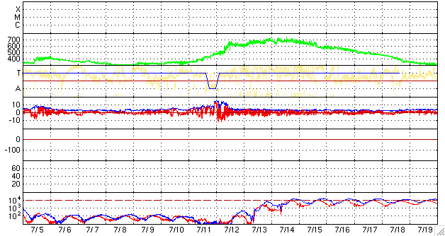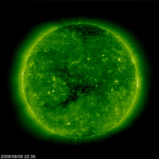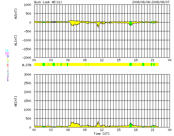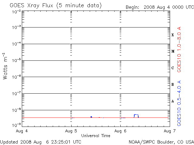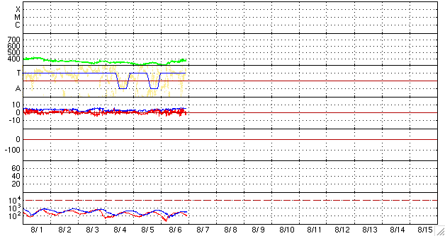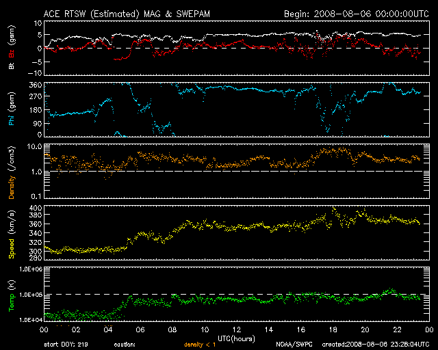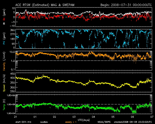 2008/ 8/ 7 08:29 更新 低速の穏やかな太陽風が続いています。これから、高速太陽風が始まりそうです。 担当 篠原 長期間更新をお休みし、申し訳ありませんでした。 日本に戻って来ましたので、今日よりニュースを再開します。 よろしくお願いします。 この10日間は、とても穏やかな宇宙天気が続きました。 太陽風はずっと低速で、ほとんどの期間で速度は400km/秒を下回っていました。 参考のため、1週間の太陽風データを掲載します。 昨日、一昨日は、速度が300km/秒近くまで下がっていました。 このため、磁気圏もとても穏やかな状態が続いています。 AE指数では、7月27-28日に中規模の活動がみられただけで、 それ以降、500nTを超える変化は起きていません。 SOHO EIT195の太陽コロナを見てください。 太陽の中心に、Vの字を横に倒した様なコロナホールが見えています。 分布は27日前とほぼ同じで、これから高速太陽風がやって来ると予想されます。 27日周期の図から予想すると、 速度の上昇は、今夜か明日に始まると思われます。 前周期の最高速度は700km/秒。 高速風は、6日間続きました。 今回も同程度の高速風がやって来そうです。 太陽は、7月22日以来、無黒点の日が続いています。 現在も活動的な領域は見られず、無黒点の状態は続きそうです。 放射線帯高エネルギー電子も、低いレベルが続いています。 こちらは、高速風の到来後の変化に注意が必要です。 ACE衛星による1週間の太陽風データ。速度の遅い、穏やかな太陽風が続いています。 (c) NOAA/SWPC ![]() SOHO EIT195による、太陽コロナの様子。7日7時半(世界時6日22時半)。 (c) SOHO (ESA & NASA) ![]() ACEが観測した太陽風の磁場(1番上の枠、白線は全体の強度、赤線は南北成分) および、太陽風の密度(3番目の橙線)、速度(4番目の黄線) (c) NOAA/SWPC ![]() リアルタイムAE指数 下段のAEグラフの値が高くなると、オーロラ活動が活発化しています。 (c) 京都大学, NICT ![]() シベリアで観測された3日間の磁場データ 右側の3分の1が、昨日のデータになります。グラフが上がったり下がったりすると、オーロラ活動が活発化しています。 (c) NICT ![]() 27日の太陽周期に合わせたデータプロット 太陽が同じ面を地球に向けていた27日前の変化から、今後を予想することができます。 (c) NICT