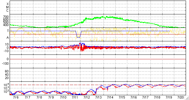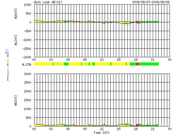 ACEが観測した太陽風の磁場(1番上の枠、白線は全体の強度、赤線は南北成分) および、太陽風の密度(3番目の橙線)、速度(4番目の黄線) (c) NOAA/SWPC ![]() リアルタイムAE指数 下段のAEグラフの値が高くなると、オーロラ活動が活発化しています。 (c) 京都大学, NICT ![]() シベリアで観測された3日間の磁場データ 右側の3分の1が、昨日のデータになります。グラフが上がったり下がったりすると、オーロラ活動が活発化しています。 (c) NICT ![]() 27日の太陽周期に合わせたデータプロット 太陽が同じ面を地球に向けていた27日前の変化から、今後を予想することができます。 (c) NICT