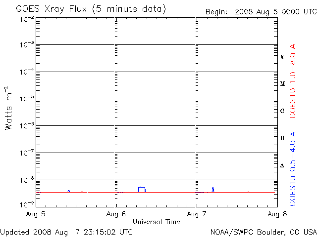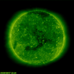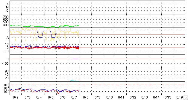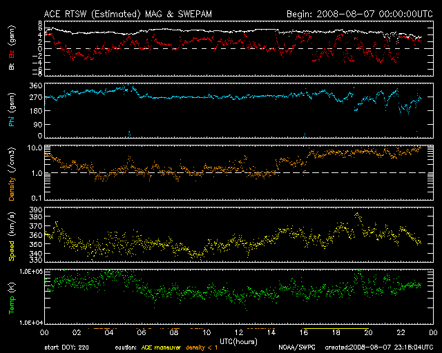 2008/ 8/ 8 08:18 更新 低速の太陽風が続いています(360km/秒)。高速太陽風の到来が近づいています。 担当 篠原 沖縄の磁場データが回復しました。 情報BOXの表示が、全て揃う様になりました。 速度360km/秒の低速太陽風が続いています。 磁場強度も5nTで安定しており、まだ変化はありません。 密度(橙色線)だけは、1個/cm^3から10個/cm^3近くへ増加しており、 この変化が高速風の前触れである可能性はあります。 27日周期の図を参考にすると、 昨夜くらいから、磁場強度も強まりそうだったのですが、 今周期は、やや遅れている様です。 太陽風が穏やかですので、磁気圏もとても静かです。 AE指数には、全く変化が見られません。 シベリアの磁場データも、3日間を通して、 ほとんどまっすぐな線になっています。 SOHO EIT195のコロナホールは、着実に太陽の西側へ移動しています。 既に、地球へ向かって高速風は飛び出しており、 それがいつ到来するかというだけです。 今日のうちには、変化が始まるのではないでしょうか。 前周期は、高速風は6日間続き、速度は700km/秒くらいまで上昇しました。 今回も、同程度の乱れがやってくるでしょう。 太陽風磁場の乱れは、高速風の前半に起こります。 その影響で、磁気圏の乱れも、高速風の前半で強まる傾向があります。 太陽は、今日も無黒点です。 X線のグラフは、全く変化が見られません。 放射線帯高エネルギー電子は、低いレベルで安定しています。 高速風の到来以降、変化に注意してください。 SOHO衛星のEIT195カメラの映像 (c) SOHO (ESA & NASA)