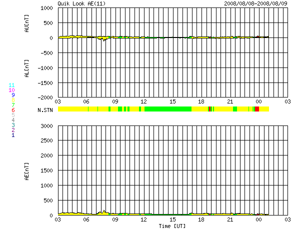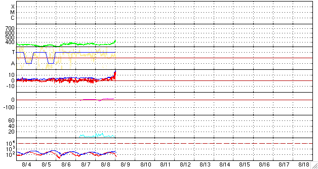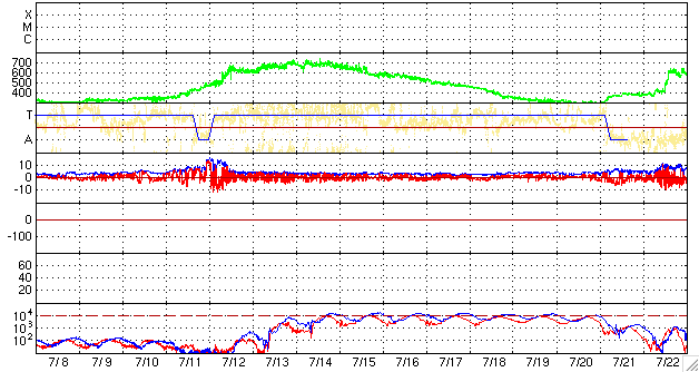 ACEが観測した太陽風の磁場(1番上の枠、白線は全体の強度、赤線は南北成分) および、太陽風の密度(3番目の橙線)、速度(4番目の黄線) (c) NOAA/SWPC ![]() リアルタイムAE指数 下段のAEグラフの値が高くなると、オーロラ活動が活発化しています。 (c) 京都大学, NICT ![]() シベリアで観測された3日間の磁場データ 右側の3分の1が、昨日のデータになります。グラフが上がったり下がったりすると、オーロラ活動が活発化しています。 (c) NICT ![]() 27日の太陽周期に合わせたデータプロット 太陽が同じ面を地球に向けていた27日前の変化から、今後を予想することができます。 (c) NICT