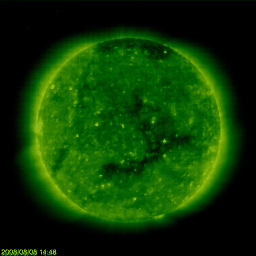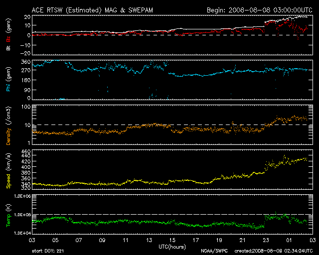 2008/ 8/ 9 11:35 更新 太陽風の磁場強度が20nTへ強まっています。高速太陽風が始まりつつあります。 担当 篠原 前周期よりも1日半ほど遅れて、いよいよ高速太陽風が始まりそうです。 ACEのデータで、磁場強度が大きく強まり、速度が高まり始めています。 磁場強度は、昨日の5nTからじわじわと強まり 今朝、9日8時(世界時8日23時)頃に10nTまで上昇しました。 そこで、不連続な磁場変化が見られ、以降、一気に20nTまで強まっています。 太陽風速度も、ACEの図の後半からゆるやかな上昇が始まり、 340km/秒から420km/秒へ上がっています。 しかし、変化の幅はまだ小さく、通常の速度に戻った程度です。 太陽風の磁場強度はかなり強まっています。 今後、太陽風速度は大きく上昇することになるでしょう。 また、磁場の南北成分は、これまでは北向きで推移しています。 このため、磁気圏への影響は小さく、AE指数は全く変化が見られません。 しかし、今後、磁場の傾向が変わり、南を向く様になると、 強度が強まっているだけに大きく南に振れ、磁気圏を一気に活動的にする可能性があります。 速度の上昇とともに、磁場南北成分の変化にも注目してください。 27日周期の図を見ると、太陽風の変化は1日半ほど遅れて始まっています。 このため、継続期間や最高速度がどのようになるか注目されます。 SOHO EIT195では、コロナホールは最後尾が太陽の中心を通過しつつあります。 このことから、高速風はこれから4〜5日間は続くだろうと思います。 太陽は無黒点のままで、たいへん穏やかです。 放射線帯高エネルギー電子も低いレベルで安定しています。 こちらは、高速風の開始後に注意が必要です。 SOHO衛星のEIT195カメラの映像 (c) SOHO (ESA & NASA)