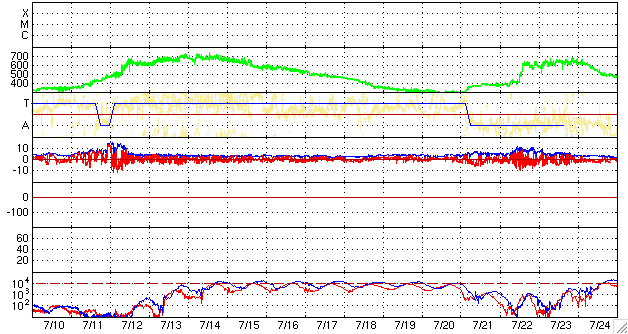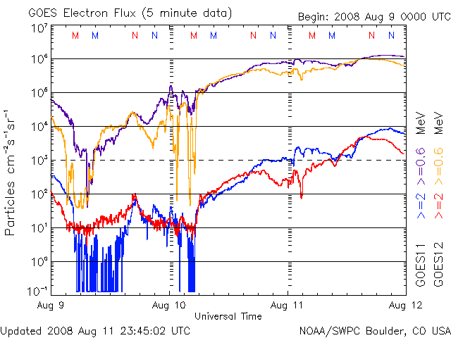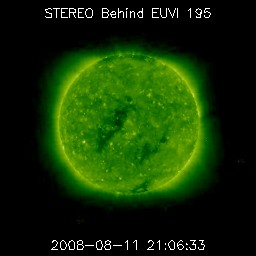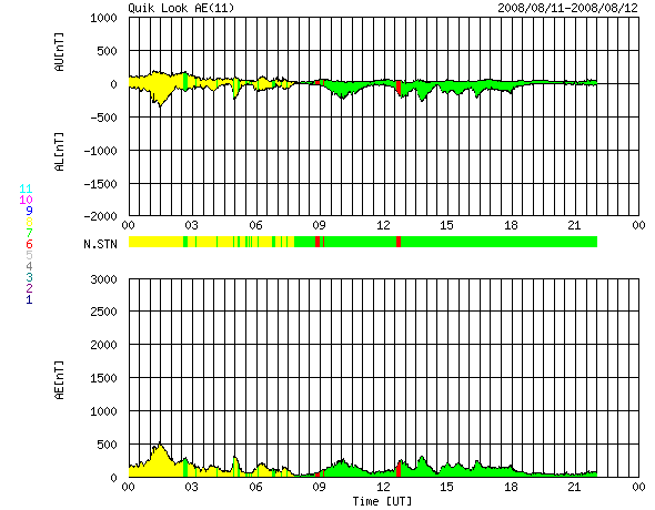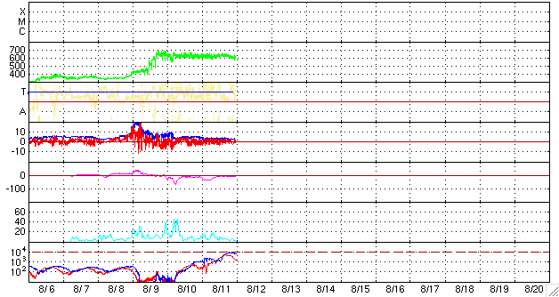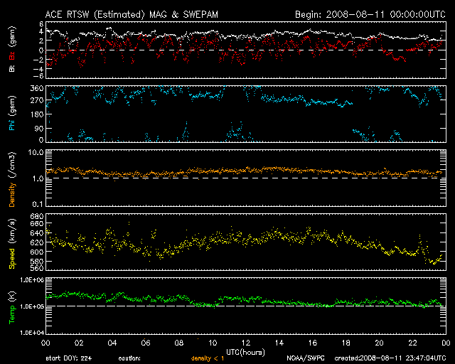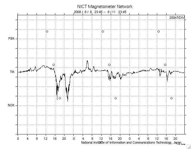 2008/ 8/12 08:48 更新 600km/秒の高速太陽風が続いています。太陽風速度は、これから次第に下がって行くでしょう。 担当 篠原 の高速太陽風が続いています。 昨日より速度はほとんど変わらず、安定しています。 磁場強度は、一段下がって、5nTから3nTへ弱まっています。 このことから、高速風は後半に入ったと思われます。 高速風は続いていますが、磁気圏のオーロラ活動は、 連続しているものの、既に規模は小さくなっています。 AE指数では、300nT前後の小規模の変動に留まっています。 太陽風の磁場強度が落ちて来たため、 南向き成分も小さいものしか現れなくなっているためです。 高速風は、これから次第に速度が下がって行くと予想されます。 これから2〜3日かけて、通常の速度へ落ち着いて行くでしょう。 一方、太陽では、次のコロナホールが中心を通過しつつあります。 STEREO Behindのコロナ写真を見てください。 太陽の中心からやや西(右)にかけて、コロナホールが見えています。 この衛星は、地球よりも2日ほど先を見ていますので、 このコロナホールは、地球から見て、ちょうど太陽の中心に達した頃です。 すると、3日後、15日くらいに影響がやって来る可能性があります。 また、もうひとつのコロナホールは、STEREOで太陽の中心線に達しつつあります。 こちらは、5〜6日後、17〜18日頃に影響が始まるでしょう。 放射線帯高エネルギー電子は、もう一段増えて、 10,000の警戒ラインに近づいています。 引き続き注目してください。 太陽は無黒点のままです。 7月21日以来無黒点が続き、22日間連続になっています。 STEREO衛星が撮影した、太陽コロナの写真。12日6時(世界時11日21時)。 (c) NASA ![]() ACEが観測した太陽風の磁場(1番上の枠、白線は全体の強度、赤線は南北成分) および、太陽風の密度(3番目の橙線)、速度(4番目の黄線) (c) NOAA/SWPC ![]() リアルタイムAE指数 下段のAEグラフの値が高くなると、オーロラ活動が活発化しています。 (c) 京都大学, NICT ![]() シベリアで観測された3日間の磁場データ 右側の3分の1が、昨日のデータになります。グラフが上がったり下がったりすると、オーロラ活動が活発化しています。 (c) NICT ![]() 27日の太陽周期に合わせたデータプロット 太陽が同じ面を地球に向けていた27日前の変化から、今後を予想することができます。 (c) NICT
