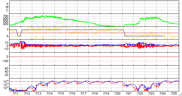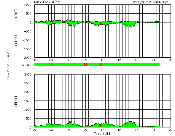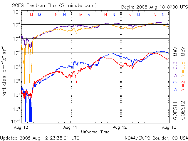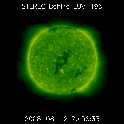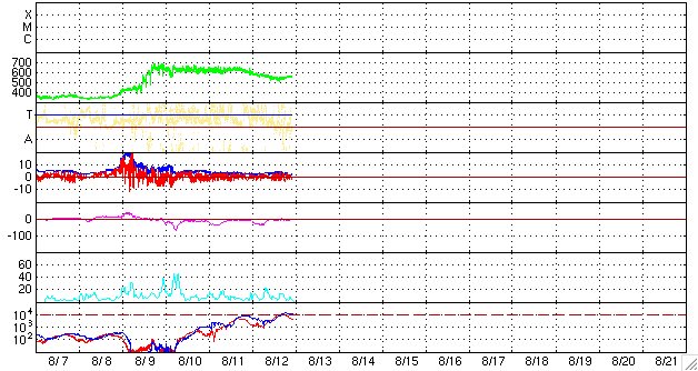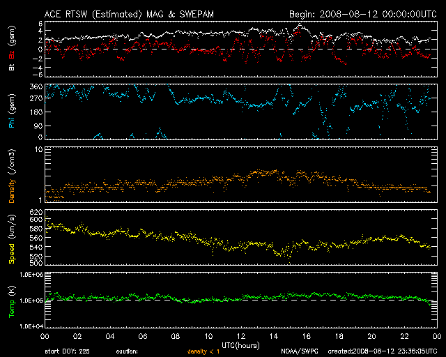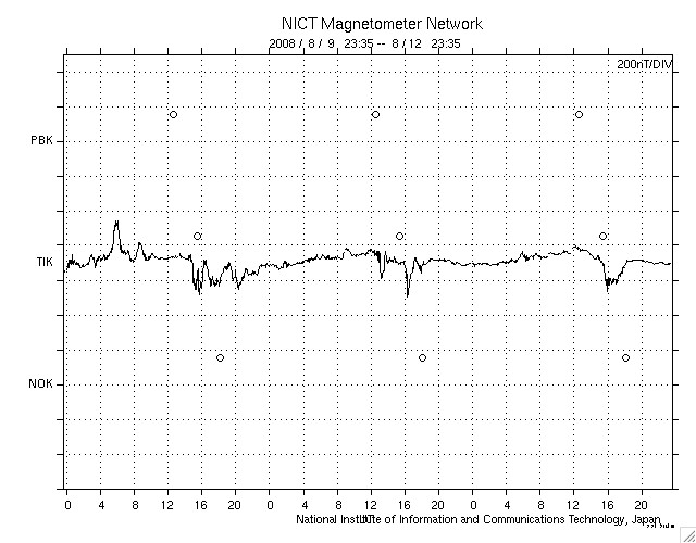 2008/ 8/13 08:37 更新 太陽風の速度は、550km/秒へ下がりました。高速風は終わりに向かっています。 担当 篠原 高速太陽風は、終盤へ向かっています。 速度は、600km/秒から550km/秒へ下がり、 この後も、引き続き低下に向かうと思われます。 太陽風の磁場強度も、3nT前後に弱まったままです。 磁気圏のオーロラ活動も、続いてはいますが、規模は小さなものだけです。 AE指数で、300nTくらいの小規模活動が連続して起こっています。 太陽風の速度は、低下の傾向が続き、 明日くらいで高速風領域を抜け出すのではないでしょうか。 その後、昨日お伝えした様に、 15日頃に、次の太陽風の乱れが来る可能性があります。 そして、17〜18日からは、7月22日以降に見られた高速風の回帰が始まります。 その発生源であるコロナホールは、STEREO Behindのカメラで、 ちょうど太陽のまん中に見えています。 放射線帯の高エネルギー電子は、更に上昇し、 10,000の警戒レベルに、GOES11(青線)、GOES12(赤線)ともに達しました。 衛星の運用では注意が必要な状態になっています。 この状態は、これから数日間続くと予想されます。 太陽黒点は、最新の写真が見られないのですが、 SWPCのレポートでは、黒点は見られないとのことです。 STEREOの写真の中心に、小さく光る部分があります。 ここに黒点が発生するかもしれません。 STEREO衛星が撮影した、太陽コロナの写真。13日6時(世界時12日21時)。 (c) NASA ![]() ACEが観測した太陽風の磁場(1番上の枠、白線は全体の強度、赤線は南北成分) および、太陽風の密度(3番目の橙線)、速度(4番目の黄線) (c) NOAA/SWPC ![]() リアルタイムAE指数 下段のAEグラフの値が高くなると、オーロラ活動が活発化しています。 (c) 京都大学, NICT ![]() シベリアで観測された3日間の磁場データ 右側の3分の1が、昨日のデータになります。グラフが上がったり下がったりすると、オーロラ活動が活発化しています。 (c) NICT ![]() 27日の太陽周期に合わせたデータプロット 太陽が同じ面を地球に向けていた27日前の変化から、今後を予想することができます。 (c) NICT
