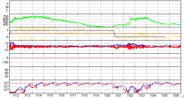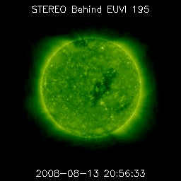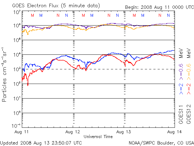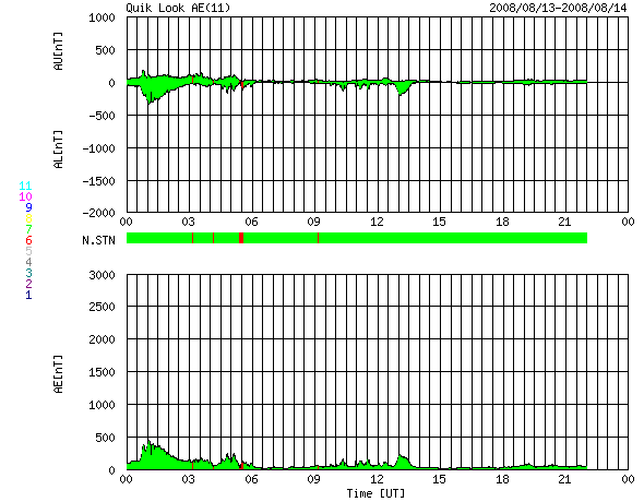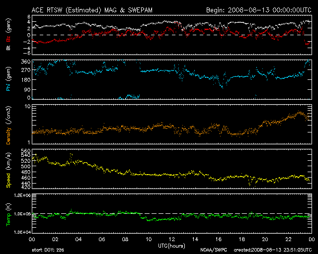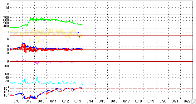 2008/ 8/14 08:52 更新 高速太陽風は終わりつつあります(460km/秒)。磁気圏も静穏になっています。 担当 篠原 太陽風の速度は、ゆっくりと低下を続けています。 昨日の550km/秒からもう一段下がって、現在は、460km/秒です。 やや高めの速度という値で、高速風は間もなく終わりそうです。 磁場強度も3nTと、弱まった状態で落ち着いています。 速度が下がったので、磁気圏も静穏になっています。 AE指数のグラフでは、初めに小規模活動が見られますが、 後半はほとんど振れなくなっています。 27日周期の図を見ると、今回、高速太陽風は5日間程度続きました。 始まりは遅くなりましたが、 速度が下がって行く後半は、前周期とほとんど同じタイミングでした。 今後の予想ですが、 太陽風は更に速度を下げながら、穏やかになっていくでしょう。 前周期の変化では、このまま穏やかな太陽風が4日ほど続きそうです。 しかし、STEREOの写真では、既に通り過ぎていますが、 細長いコロナホールの影響が15日頃にやって来るかもしれません。 前周期との比較で、注目しています。 そして、17-18日頃に次の高速風がやって来ます。 発生源のコロナホールは、STEREOの写真で、太陽の中心に見えています。 前周期、7月22日から24日にかけて続いた高速風の回帰です。 コロナホールが縦に細長いため、継続期間は短くなりそうです。 放射線帯高エネルギー電子は、警戒レベルが続いています。 太陽風が穏やかになったので、放射線帯電子の減衰はゆっくりになり、 高い状態がしばらく続きます。 太陽は無黒点です。 とても穏やかです。 STEREO衛星が撮影した、太陽コロナの写真。14日6時(世界時13日21時)。 (c) NASA ![]() ACEが観測した太陽風の磁場(1番上の枠、白線は全体の強度、赤線は南北成分) および、太陽風の密度(3番目の橙線)、速度(4番目の黄線) (c) NOAA/SWPC ![]() リアルタイムAE指数 下段のAEグラフの値が高くなると、オーロラ活動が活発化しています。 (c) 京都大学, NICT ![]() シベリアで観測された3日間の磁場データ 右側の3分の1が、昨日のデータになります。グラフが上がったり下がったりすると、オーロラ活動が活発化しています。 (c) NICT ![]() 27日の太陽周期に合わせたデータプロット 太陽が同じ面を地球に向けていた27日前の変化から、今後を予想することができます。 (c) NICT