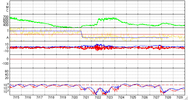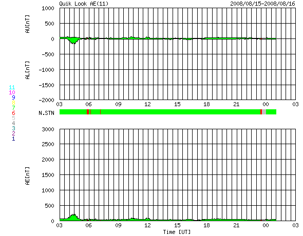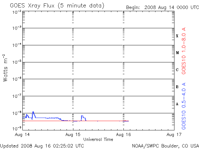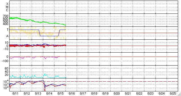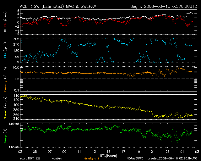 2008/ 8/16 11:27 更新 太陽風は低速になり(350km/秒)、磁気圏はとても穏やかです。 担当 篠原 太陽風の速度は更に下がり、350km/秒の低速風になっています。 昨日以降、目立った乱れはなく、 結局、前周期同様の穏やかな太陽風が続いています。 磁場強度も2nTに弱まったままです。 磁気圏も、非常に穏やかな状態が続いています。 AE指数にはほとんど変化が見られません。 明日、もしくは明後日くらいから、次の高速風がやって来そうです。 27日周期の図で予想すると、高速風の到来は18日の遅くになりそうですが、 今回、コロナホールがやや広がっている様ですので、 到来も早まる可能性があります。 高速風の規模は、前周期と似た様なものでしょう。 太陽は無黒点が続いています。 7月21日以来、昨日までで26日間継続しています。 今極小の最長は、昨年10-11月にかけて続いた28日間だったのですが、 STEREOによる現在の太陽の様子では、これを超えるかもしれません。 放射線帯高エネルギー電子は、1000で安定しています。 STEREO衛星が撮影した、太陽コロナの写真。16日10時(世界時16日1時)。 (c) NASA ![]() ACEが観測した太陽風の磁場(1番上の枠、白線は全体の強度、赤線は南北成分) および、太陽風の密度(3番目の橙線)、速度(4番目の黄線) (c) NOAA/SWPC ![]() リアルタイムAE指数 下段のAEグラフの値が高くなると、オーロラ活動が活発化しています。 (c) 京都大学, NICT ![]() シベリアで観測された3日間の磁場データ 右側の3分の1が、昨日のデータになります。グラフが上がったり下がったりすると、オーロラ活動が活発化しています。 (c) NICT ![]() 27日の太陽周期に合わせたデータプロット 太陽が同じ面を地球に向けていた27日前の変化から、今後を予想することができます。 (c) NICT