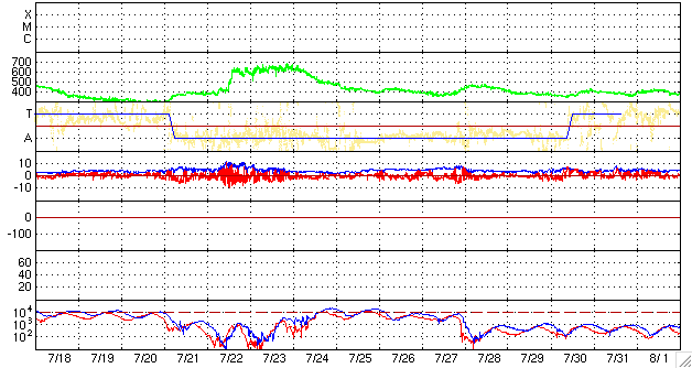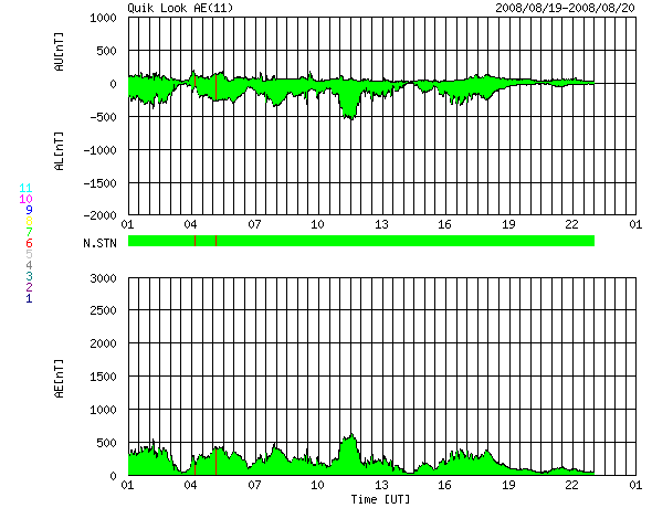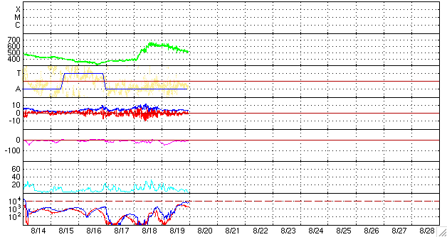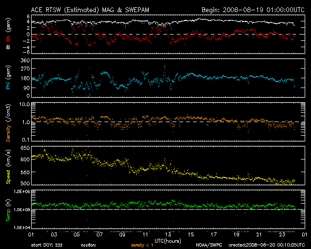 2008/ 8/20 09:06 更新 太陽風の速度は500km/秒に下がり、高速風は終わりに近づいています。 担当 篠原 昨日のニュースのすぐ後から、太陽風の速度は低下を始めました。 半日ほどで550km/秒を割り、現在は500km/秒近くまで下がっています。 27日周期の図で、前周期の変化と比較してください。 600km/秒台の継続時間がだいぶ短くなり、高速風の山は小ぶりになっています。 太陽風の速度は、引き続きゆっくりと低下し、 今日いっぱいで高速風は終わるかもしれません。 磁気圏のオーロラ活動は、 AE指数で400nT前後の小規模活動ですが、ほとんど連続して発生していました。 昨日から続いていますが、 太陽風の磁場が比較的南寄りの傾向を持っているためでしょう。 しかし、速度が下がって来ていますので、 今後の活動は規模が次第に小さくなっていきます。 今日いっぱいくらいで高速風領域を抜けると、静穏な日がしばらく続きます。 次にやって来る高速風は、9月5日くらいになりそうです。 16日も先ですから、太陽が半周以上することになります。 今日のSTEREOの写真には、コロナホールの姿は見られません。 ですので、これから10日間程度穏やかな太陽風が続くことは確かでしょう。 その後のことは、これから太陽が回転して、 新しいコロナホールが出現していないことを確認する必要があります。 放射線帯高エネルギー電子は、増加が続き、10,000にだいぶ近づいています。 しかし、高速風が終わりつつあるので、今回の増加は、 明日、10,000に達しているかどうかという程度ではないかと思われます。 もうしばらく注意してください。 太陽は、今日も黒点は見られず、30日に渡って無黒点となっています。 SOHOの可視光写真がないので、磁場の写真を掲載します。 黒点に特徴的な、磁場の強い領域は見られません。 太陽は27日くらいで自転していますから、 ぐるっとひとまわり黒点が消えていたことになります (もちろん、地球の反対側で発生していた可能性はあります)。 23期から24期に移り変わる極小期の底を、 ちょうど今、迎えているのではないでしょうか。 STEREO衛星が撮影した、太陽コロナの写真。20日6時(世界時19日21時)。 (c) NASA ![]() SOHOによる太陽の磁場写真。黒点にともなう磁場の強まりが見られません。20日1時(世界時19日16時) (c) SOHO (ESA & NASA) ![]() ACEが観測した太陽風の磁場(1番上の枠、白線は全体の強度、赤線は南北成分) および、太陽風の密度(3番目の橙線)、速度(4番目の黄線) (c) NOAA/SWPC ![]() リアルタイムAE指数 下段のAEグラフの値が高くなると、オーロラ活動が活発化しています。 (c) 京都大学, NICT ![]() シベリアで観測された3日間の磁場データ 右側の3分の1が、昨日のデータになります。グラフが上がったり下がったりすると、オーロラ活動が活発化しています。 (c) NICT ![]() 27日の太陽周期に合わせたデータプロット 太陽が同じ面を地球に向けていた27日前の変化から、今後を予想することができます。 (c) NICT