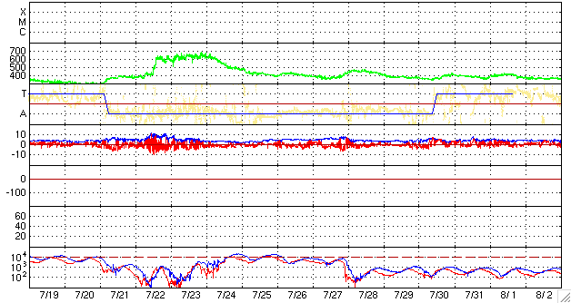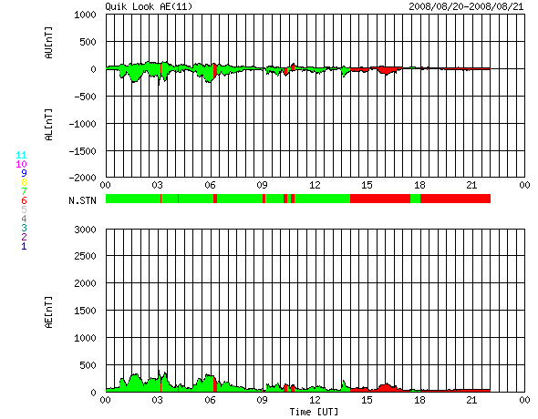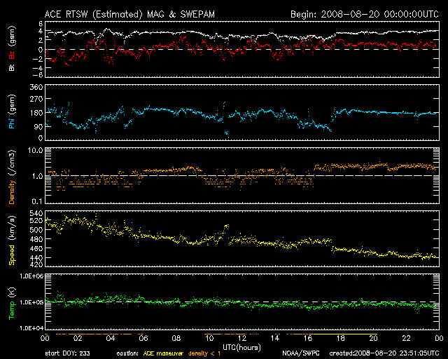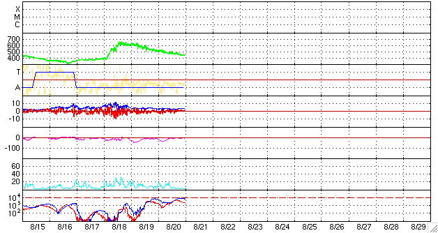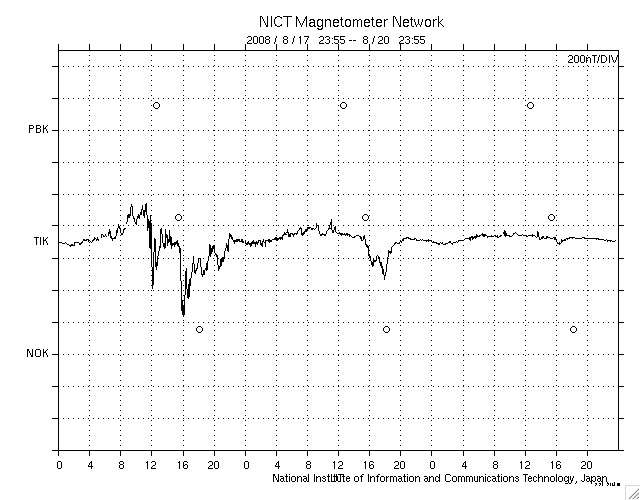 2008/ 8/21 08:52 更新 高速の太陽風は終わりに近づき(440km/秒)、磁気圏も穏やかになっています。太陽は無黒点が続いています。 担当 篠原 太陽風の速度は低下を続け、440km/秒まで下がりました。 太陽風は、通常の速度に戻りつつあります。 磁気圏の活動も、一段とおとなしくなっています。 AE指数では、前半に300nTの小規模活動が見られていますが、 後半は変化がとても小さくなっています。 シベリアの磁場データを見ると、 この3日間、日毎に活動が小さくなっていた様子がよく分かります。 高速風が終わり、これから長い静穏な日が続きます。 昨日も書きましたが、27日周期の予想では、次の乱れは9月5日頃になりそうです。 STEREOの太陽コロナを見てください。 コロナホールの暗い領域は見られず、今周期も穏やかな太陽風が続きそうです。 放射線帯高エネルギー電子は、若干強まりましたが、 10,000の警戒レベルには達しませんでした。 高速風も終わり、高エネルギー電子の増加もここまでではないでしょうか。 太陽は今日も無黒点の様です。 SOHOの太陽黒点の写真は、更新がないのですが、 磁場写真を見ると、黒点を伴う様な磁場の強い領域は見られません。 STEREOでも、明るく光る活動領域は見られず、無黒点はまだ続きそうです。 STEREO衛星が撮影した、太陽コロナの写真。21日6時(世界時20日21時)。 (c) NASA ![]() SOHOによる太陽の磁場写真。磁場の強まりはなく、穏やかな太陽です。21日1時(世界時20日16時) (c) SOHO (ESA & NASA) ![]() ACEが観測した太陽風の磁場(1番上の枠、白線は全体の強度、赤線は南北成分) および、太陽風の密度(3番目の橙線)、速度(4番目の黄線) (c) NOAA/SWPC ![]() リアルタイムAE指数 下段のAEグラフの値が高くなると、オーロラ活動が活発化しています。 (c) 京都大学, NICT ![]() シベリアで観測された3日間の磁場データ 右側の3分の1が、昨日のデータになります。グラフが上がったり下がったりすると、オーロラ活動が活発化しています。 (c) NICT ![]() 27日の太陽周期に合わせたデータプロット 太陽が同じ面を地球に向けていた27日前の変化から、今後を予想することができます。 (c) NICT