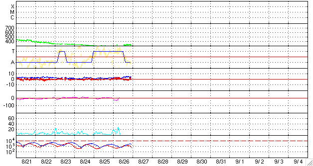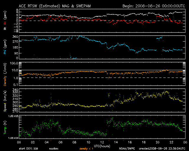 - 2008/ 8/26 09:43 太陽風の速度は290km/秒へ下がり、かなり低速になっています。磁気圏も穏やかです。