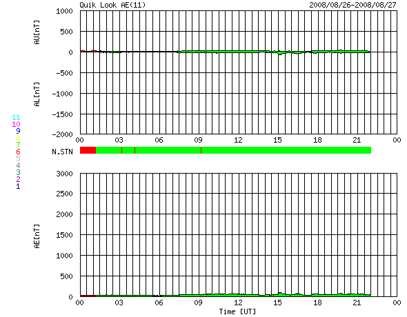 右側の3分の1が、昨日のデータになります。グラフが上がったり下がったりすると、オーロラ活動が活発化しています。