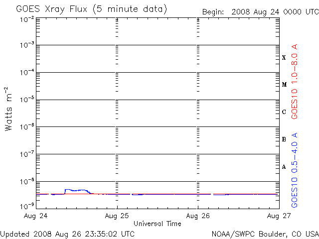 - 2008/ 8/25 09:00 太陽風の速度は300km/秒に下がり、低速で穏やかです。穏やかな状態は当分続きます。