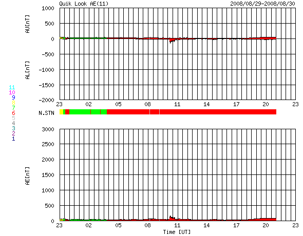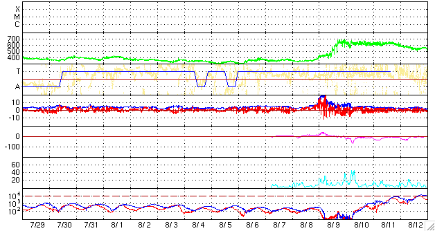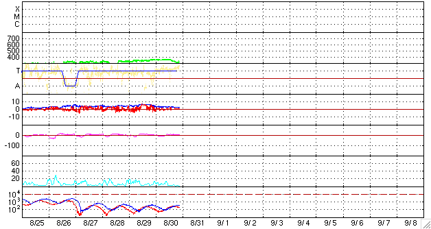 ACEが観測した太陽風の磁場(1番上の枠、白線は全体の強度、赤線は南北成分) および、太陽風の密度(3番目の橙線)、速度(4番目の黄線) (c) NOAA/SWPC ![]() リアルタイムAE指数 下段のAEグラフの値が高くなると、オーロラ活動が活発化しています。 (c) 京都大学, NICT ![]() シベリアで観測された3日間の磁場データ 右側の3分の1が、昨日のデータになります。グラフが上がったり下がったりすると、オーロラ活動が活発化しています。 (c) NICT ![]() 27日の太陽周期に合わせたデータプロット 太陽が同じ面を地球に向けていた27日前の変化から、今後を予想することができます。 (c) NICT