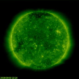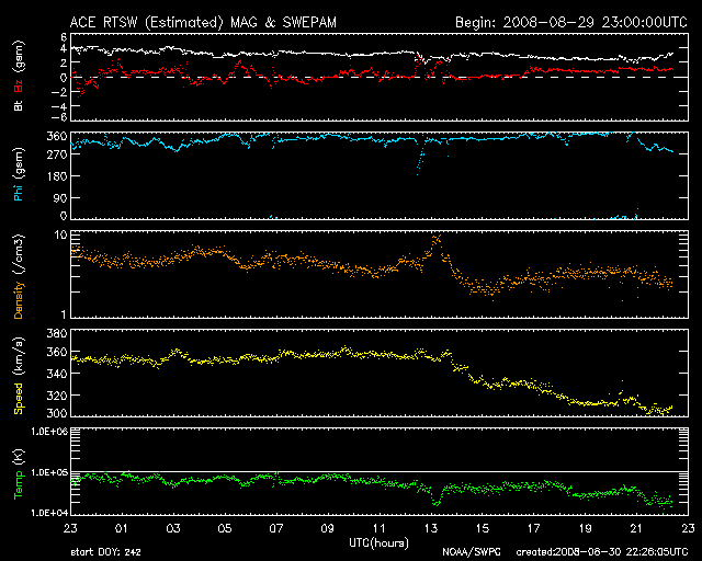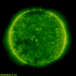 2008/ 8/31 07:27 更新 太陽風はとても低速で、磁気圏も静穏です。次の高速風の到来が、早まるかもしれません。 担当 篠原 350km/秒に上昇した太陽風速度は、31日に入った頃に再び下がり、 現在、300km/秒ほどになっています。 かなり遅い速度です。 それとともに磁場強度も下がり、3nTに弱まっています。 太陽風とても穏やかです。 このため、磁気圏も非常に静かです。 相変わらず、AE指数は完全に平坦です。 SOHO EIT195で、コロナホールがよく見えて来ましたので、 27日前(太陽が同じ面を向けていたとき)の様子と比較しましょう。 掲載のSOHOの写真は、左が現在、右が27日前です。 どちらの写真でも、太陽の南東寄り(左下)に薄暗い領域が見えています。 高速太陽風の発生源のコロナホールです。 現在の位置を前周期の位置と比べると、コロナホールは少し右側へ前進している様です。 前周期(右)の写真では、コロナホールは、東側の半分程度にしか届いていませんが、 現在(左)の写真では、もうすぐ太陽の中心線に達するくらいに見えています。 現在の位置から考えると、コロナホールは明日には太陽の中心線に達しそうです。 高速太陽風はその3日後くらいにやって来ますから、 合わせて考えると、今周期の高速風は少し早まって、9月4日くらいにやって来るかもしれません。 前周期と比較すると、1日半程度早まる可能性があります。 位置が変わっていることから、広がりにも変化が見られそうです。 これから、コロナホールの全体が見えてくるのを待ちましょう。 太陽は無黒点が続いていて、非常に静穏です。 SOHO衛星のEIT195カメラの映像 (c) SOHO (ESA & NASA)