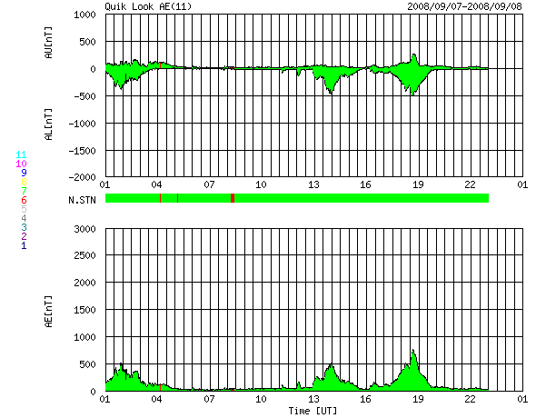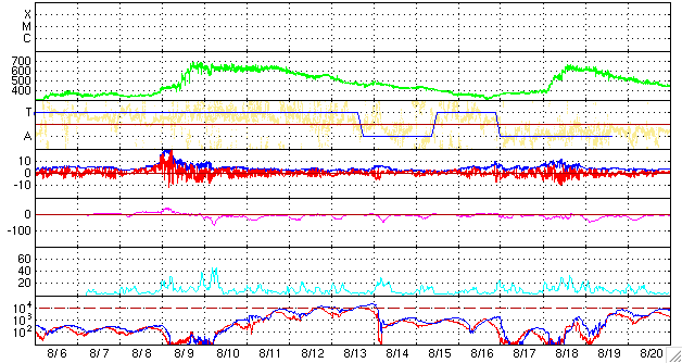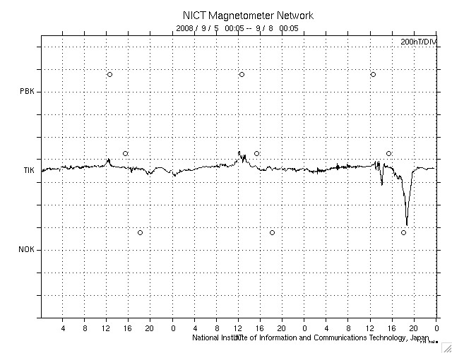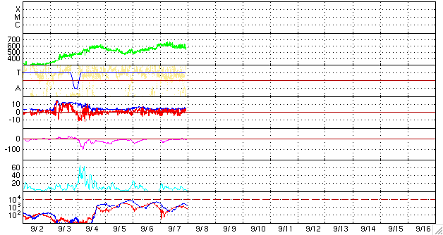 ACEが観測した太陽風の磁場(1番上の枠、白線は全体の強度、赤線は南北成分) および、太陽風の密度(3番目の橙線)、速度(4番目の黄線) (c) NOAA/SWPC ![]() リアルタイムAE指数 下段のAEグラフの値が高くなると、オーロラ活動が活発化しています。 (c) 京都大学, NICT ![]() シベリアで観測された3日間の磁場データ 右側の3分の1が、昨日のデータになります。グラフが上がったり下がったりすると、オーロラ活動が活発化しています。 (c) NICT ![]() 27日の太陽周期に合わせたデータプロット 太陽が同じ面を地球に向けていた27日前の変化から、今後を予想することができます。 (c) NICT
