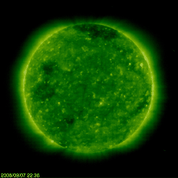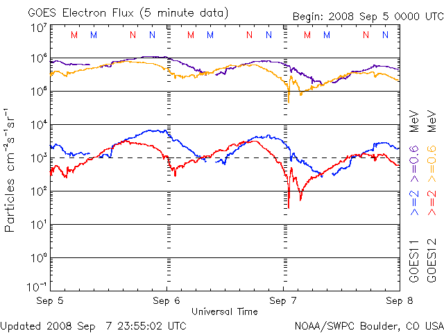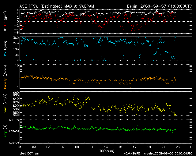 2008/ 9/ 8 09:02 更新 高速太陽風は安定して続いています。これから終わりに向かうでしょう。 担当 篠原 高速太陽風が続いています。 速度は、600km/秒を回復したまま、ほぼ安定しています。 磁場強度は4nT。 南北成分は、比較的北寄りになっていて、 最初とまん中あたりに、南向きになっている時間帯が見られます。 そして、ちょうどこのタイミングで、磁気圏のオーロラ活動が発生しています。 AE指数では、500〜700nTくらいで、中規模の変動です。 高速太陽風は、これから終息へ向かうと思われます。 発生源のコロナホールは、太陽の西へ去りつつあります。 早ければ、今日にも速度は下がり始めるでしょう。 磁気圏のオーロラ活動も、速度の低下とともに弱まって行きます。 一方、SOHO EIT195では、太陽の東側(左側)に次のコロナホールが見えています。 左の端あたりの、赤道から北半球側に広がっています。 このコロナホールは、27日周期の図で、 前周期の8月18日から始まる高速風をもたらしました。 この図のまま繰り返すとすると、6日後の、9月14日頃に回帰が予想されます。 放射線帯高エネルギー電子は、ゆっくりと低下を始めています。 今回は、警戒レベルに上がることはありませんでした。 太陽は無黒点のままで、とても穏やかです。 SOHO衛星のEIT195カメラの映像 (c) SOHO (ESA & NASA)