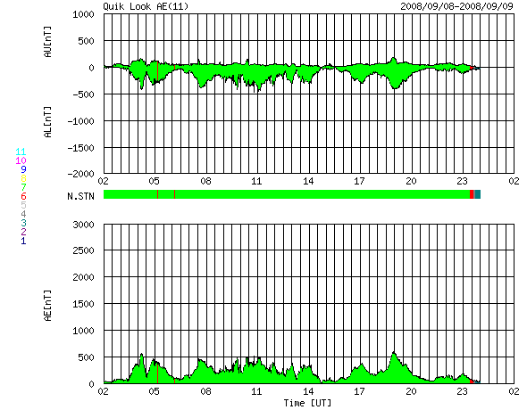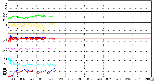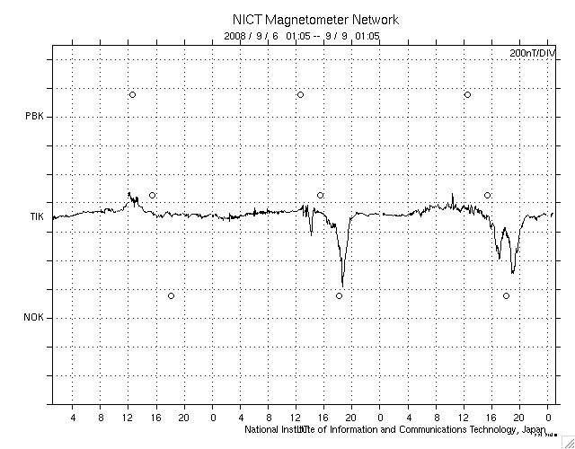 ACEが観測した太陽風の磁場(1番上の枠、白線は全体の強度、赤線は南北成分) および、太陽風の密度(3番目の橙線)、速度(4番目の黄線) (c) NOAA/SWPC ![]() リアルタイムAE指数 下段のAEグラフの値が高くなると、オーロラ活動が活発化しています。 (c) 京都大学, NICT ![]() シベリアで観測された3日間の磁場データ 右側の3分の1が、昨日のデータになります。グラフが上がったり下がったりすると、オーロラ活動が活発化しています。 (c) NICT ![]() 27日の太陽周期に合わせたデータプロット 太陽が同じ面を地球に向けていた27日前の変化から、今後を予想することができます。 (c) NICT
