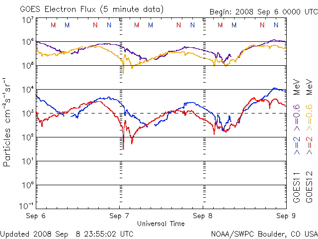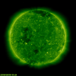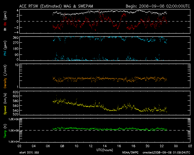 2008/ 9/ 9 10:06 更新 太陽風の速度が低下に向かっています(540km/秒)。高速風は終盤です。 担当 篠原 高速太陽風は終盤に入り、ゆっくりと速度を下げています。 昨日の600km/秒から、現在は540km/秒に下がりました。 まだ高速状態は続いていますが、今日、明日までといったところでしょう。 太陽風の磁場は、強度が3nTヘ弱まっています。 しかし、南北成分が南寄りに変わったため、地球への影響はむしろ強まっています。 AE指数を見ると、500nT前後の、小中規模のオーロラ活動が終日発生しています。 規模は小さくなりましたが、活動度としてはにぎわっています。 さて、9月4日より高速風をもたらしていたコロナホールは、 太陽の西に去りました。 太陽風の速度も、この後は下がって、通常の状態に戻るでしょう。 ここ数日にぎやかだったオーロラ活動も一段落して、磁気圏は静かになるでしょう。 そして、次のコロナホールが、太陽の中心に向かって近づいています。 次は、9月14日頃に太陽風の乱れが始まりそうです。 放射線帯の高エネルギー電子が、ぎりぎりで10,000の警戒ラインに達しています。 昨日は、これ以上増えないだろうと予想しましたが、あっさり外れてしまいました。 更に大きく増加することはないと思いますが、しばらく高めの状態が続きそうです。 太陽は、黒点は見られず、とても静かです。 SOHO衛星のEIT195カメラの映像 (c) SOHO (ESA & NASA)