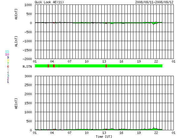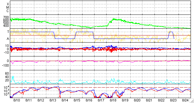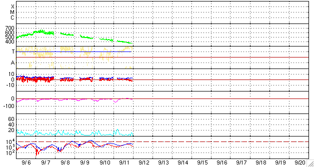 ACEが観測した太陽風の磁場(1番上の枠、白線は全体の強度、赤線は南北成分) および、太陽風の密度(3番目の橙線)、速度(4番目の黄線) (c) NOAA/SWPC ![]() リアルタイムAE指数 下段のAEグラフの値が高くなると、オーロラ活動が活発化しています。 (c) 京都大学, NICT ![]() シベリアで観測された3日間の磁場データ 右側の3分の1が、昨日のデータになります。グラフが上がったり下がったりすると、オーロラ活動が活発化しています。 (c) NICT ![]() 27日の太陽周期に合わせたデータプロット 太陽が同じ面を地球に向けていた27日前の変化から、今後を予想することができます。 (c) NICT