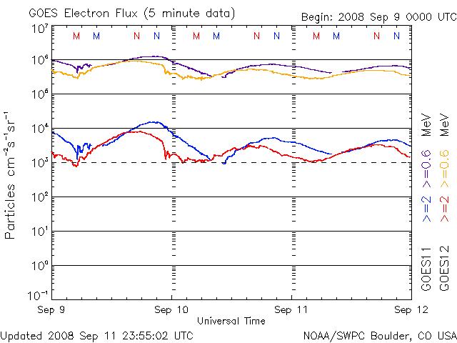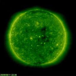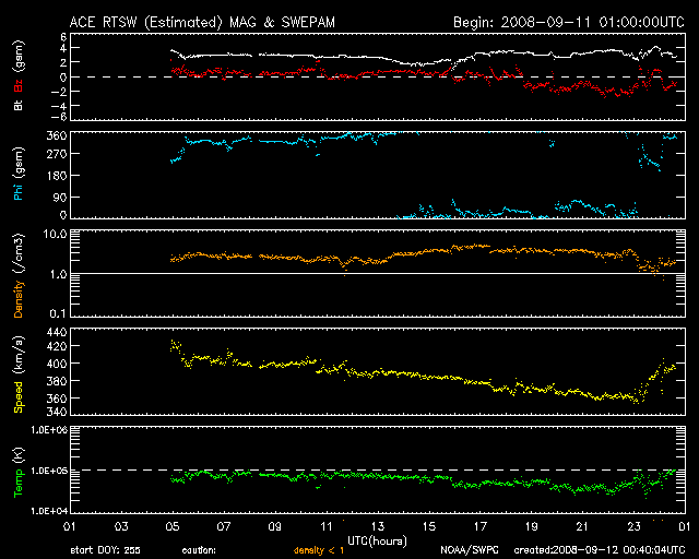 2008/ 9/12 09:43 更新 太陽風は低速になっています。磁気圏も静穏です。1001黒点群が出現したそうです。 担当 篠原 太陽風の速度は更に低下を続け、360km/秒まで下がりました。 やや低速になっています。 磁場強度は3nTで、やや弱めです。 磁気圏はとても静かで、AE指数には全く変化が見られません。 今日、明日は、このまま穏やかな状態が続くでしょう。 そして、明後日、14日くらいから、太陽風の速度が上がり、高速風が始まります。 ライブカメラなどでオーロラ観望を狙うなら、このタイミングです。 今度の高速風は規模が小さく、3日ほどで終わってしまいそうです。 SOHO EIT195を見ると、コロナホールは、既に全体が太陽の中心を通り過ぎています。 放射線帯の高エネルギー電子は、やや高めの状態です。 ゆっくりと減少しています。 太陽では、1001黒点群が出現したそうです。 掲載の太陽写真では、分かりません。 SOHO EIT195で、太陽の中心のやや左に明るく見えているところだと思われます。 とても小さな黒点のようです。 SOHO衛星のEIT195カメラの映像 (c) SOHO (ESA & NASA)