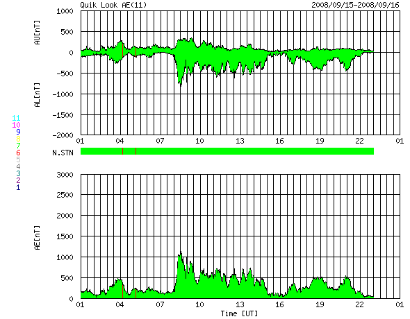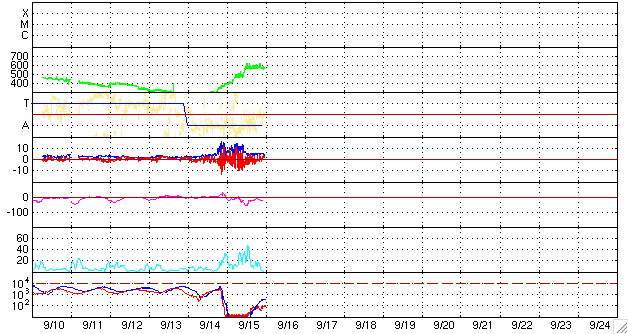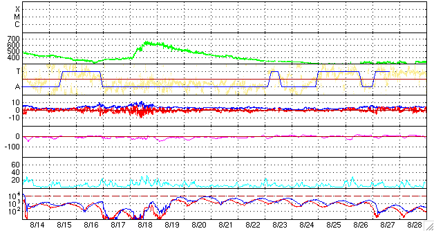 ACEが観測した太陽風の磁場(1番上の枠、白線は全体の強度、赤線は南北成分) および、太陽風の密度(3番目の橙線)、速度(4番目の黄線) (c) NOAA/SWPC ![]() リアルタイムAE指数 下段のAEグラフの値が高くなると、オーロラ活動が活発化しています。 (c) 京都大学, NICT ![]() シベリアで観測された3日間の磁場データ 右側の3分の1が、昨日のデータになります。グラフが上がったり下がったりすると、オーロラ活動が活発化しています。 (c) NICT ![]() 27日の太陽周期に合わせたデータプロット 太陽が同じ面を地球に向けていた27日前の変化から、今後を予想することができます。 (c) NICT