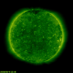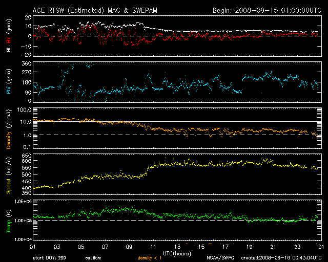 2008/ 9/16 09:43 更新 太陽風速度は580km/秒に上がりました。活発なオーロラ活動も発生しています。 担当 篠原 太陽風は、昨日のお昼頃に500km/秒、夜に入って580km/秒へ速度が上昇しました。 その間、磁場強度は10nTと強いレベルを保ち、 南北成分が変動して、-10nT近い強い南向きも発生しました。 その影響で、磁気圏では活発なオーロラ活動が発生しました。 AE指数では、500〜1000nTの中規模活動が半日程度続きました。 太陽風速度が580km/秒に上がると、磁場強度は5nTくらいに弱まりましたが、 速度が上がっているため、オーロラ活動は、 やや弱まったものの現在まで続いています。 昨日は、高速風はもう弱まっているのではないかと考えましたが、 一日遅れで、前周期とほとんど同じレベルの高速風がやって来ました。 コロナホールはすっかり西に移動していますから、 普段とは到来のタイミングが違って見えます。 とはいえ、磁場強度は弱まりつつあり、高速風は早くも後半に入っています。 この後は、1〜2日ほどで高速風は終わるでしょう。 その後は、穏やかな太陽風が10日以上続きます。 放射線帯高エネルギー電子は、磁気圏活動の影響で大きく下がっています。 今後、上昇に向かう可能性がありますので、注意してください。 太陽は無黒点で、とても静穏です。 これから1週間ほど、更新が不定期になります。 ご了解ください。 明日(17日)の更新は難しそうです。 SOHO衛星のEIT195カメラの映像 (c) SOHO (ESA & NASA)