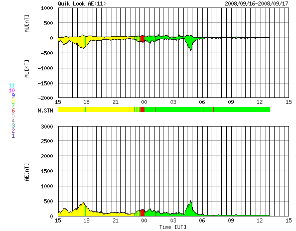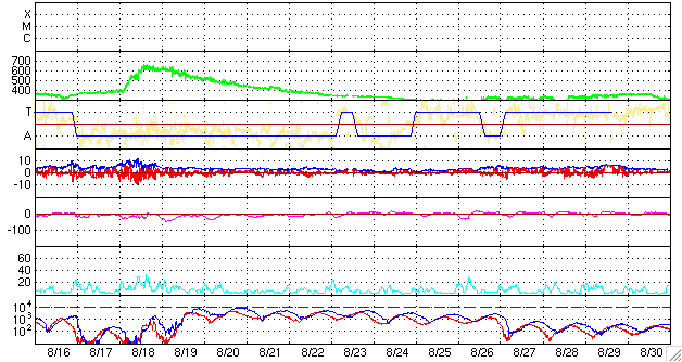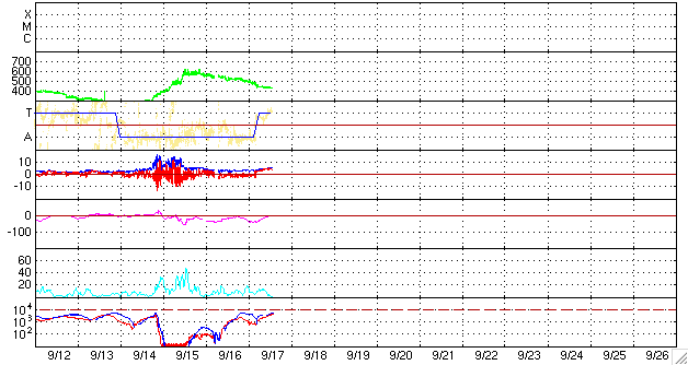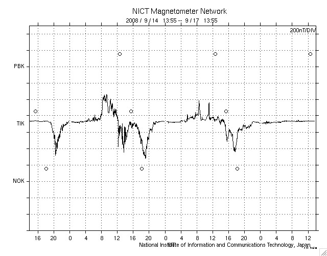 ACEが観測した太陽風の磁場(1番上の枠、白線は全体の強度、赤線は南北成分) および、太陽風の密度(3番目の橙線)、速度(4番目の黄線) (c) NOAA/SWPC ![]() リアルタイムAE指数 下段のAEグラフの値が高くなると、オーロラ活動が活発化しています。 (c) 京都大学, NICT ![]() シベリアで観測された3日間の磁場データ 右側の3分の1が、昨日のデータになります。グラフが上がったり下がったりすると、オーロラ活動が活発化しています。 (c) NICT ![]() 27日の太陽周期に合わせたデータプロット 太陽が同じ面を地球に向けていた27日前の変化から、今後を予想することができます。 (c) NICT