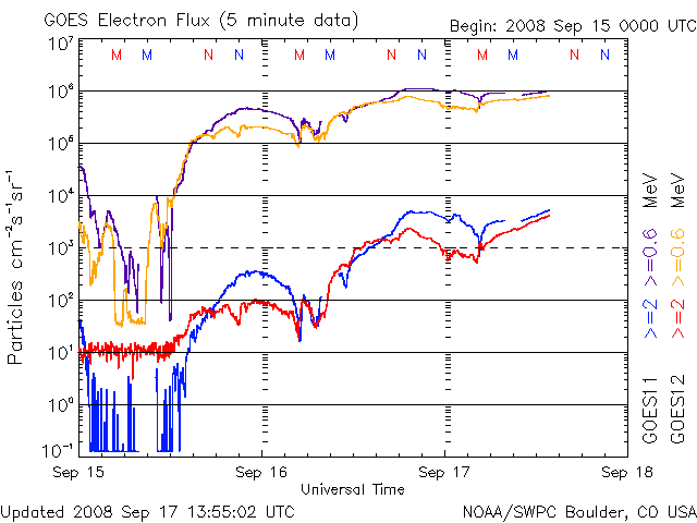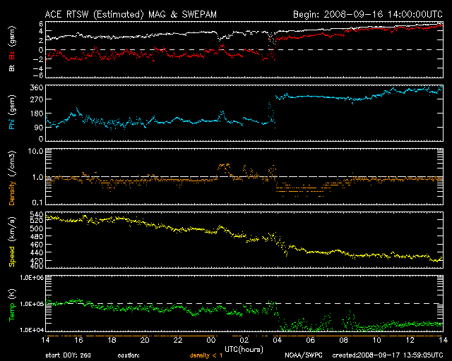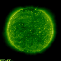 2008/ 9/17 23:00 更新 高速風は終わりました。これから穏やかな状態が、2週間近く続きます。 担当 篠原 高速太陽風は終わりました。 前のニュース以降、速度はゆっくりと低下し、 今日のお昼頃(17日15時、世界時17日6時)に440km/秒まで下がりました。 現在は、420km/秒という値になっています。 速度が下がるとともに、磁気圏活動も穏やかになっています。 AE指数では、500nTに届くくらいの小規模活動が2つ見られますが、 全体的には静かになっています。 これから12日間くらい穏やかな太陽風が続くと予想されます。 掲載している27日周期の図では、前周期のグラフは最後まで低速です。 この後、9月3日になって高速風がやって来ました。 これは、今周期の9月30日に相当します。 SOHO EIT195の太陽コロナは、ぼんやりと一様に分布していて、 コロナホールの暗い領域は見られません。 この様子からも、これから10日間は穏やかな太陽風が続くと予想されます。 放射線帯高エネルギー電子は、数千のレベルまで増加しています。 高速風は終わっているので、 この後、警戒ライン(10,000)に達するかどうかというところです。 やや高めの状態はしばらく続くでしょう。 太陽は無黒点が続いています。 とても静かです。 インドの南端の町より更新しています。 夏に戻された様な気候です。 時差の関係もあり、しばらくはこの様な時間帯の更新になります。 SOHO衛星のEIT195カメラの映像 (c) SOHO (ESA & NASA)