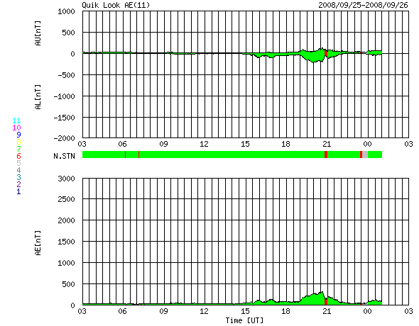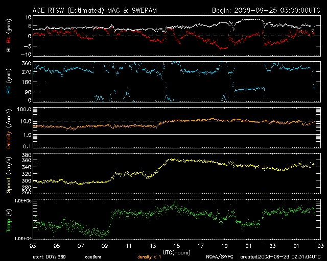 2008/ 9/26 11:31 更新 340km/秒の穏やかな太陽風が続いています。磁気圏も概ね静穏です。 担当 篠原 穏やかな宇宙天気が続いています。 太陽風の速度は、340km/秒に上がっていますが、低速状態のままです。 今日のACEの図で速度を見ると、山の様に盛り上がって見えますが、 変化の幅は小さく、遅い太陽風の中の変化です。 その様子は、27日周期の図で見ると明らかです。 速度の線(緑色)は、グラフの下の方でわずかに変化しているだけです。 それでも、ACEの図の後半で南向き磁場が-5nTにまで変化しています。 その影響で、磁気圏では小規模のオーロラ活動が発生しています。 AE指数を見ると、250nTほどの小さな変化がこの時間帯に起きています。 太陽風は、もう4〜5日ほど穏やかな状態が続くでしょう。 次の擾乱は、9月30日か10月1日頃から始まると予想されます。 発生源のコロナホールは、太陽の中心に向かって少しずつ前進しています。 (もちろん、太陽の自転による動きです) 今日のSOHO EIT195を見ると、コロナホールの先頭(右端)は、 明日か明後日に太陽の中心線に達しそうです。 太陽は無黒点で、静穏です。 1002黒点群があった場所に、現在は白斑が見えています。 2枚目に掲載している写真の、北半球(上側)の西端(右端)付近です。 SOHO EIT195による、太陽コロナの様子。26日10時半(世界時26日1時半)。 (c) SOHO (ESA & NASA) ![]() SOHO MDIによる太陽の可視光写真。西端(右端)のやや北(上)よりに白斑が見えます。 (c) SOHO (ESA & NASA) ![]() ACEが観測した太陽風の磁場(1番上の枠、白線は全体の強度、赤線は南北成分) および、太陽風の密度(3番目の橙線)、速度(4番目の黄線) (c) NOAA/SWPC ![]() リアルタイムAE指数 下段のAEグラフの値が高くなると、オーロラ活動が活発化しています。 (c) 京都大学, NICT ![]() シベリアで観測された3日間の磁場データ 右側の3分の1が、昨日のデータになります。グラフが上がったり下がったりすると、オーロラ活動が活発化しています。 (c) NICT ![]() 27日の太陽周期に合わせたデータプロット 太陽が同じ面を地球に向けていた27日前の変化から、今後を予想することができます。 (c) NICT